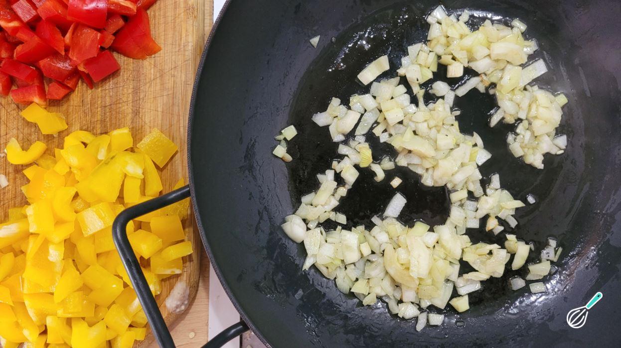 Para o recheio, coloque um pouco de azeite em uma frigideira e adicione a cebola.