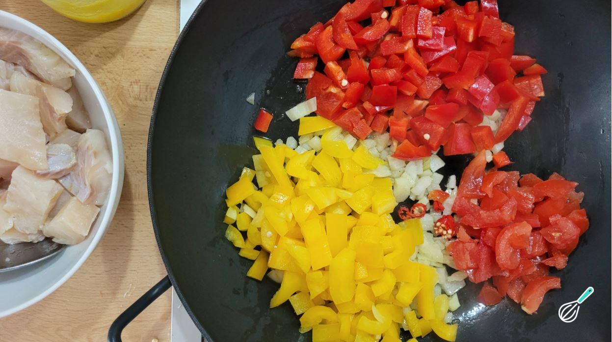 Quando a cebola estiver dourada, adicione os pimentões, a pimenta e o tomate e deixe refogar um pouco, para que os pimentões fiquem mais macios e o tomate comece a desmanchar.