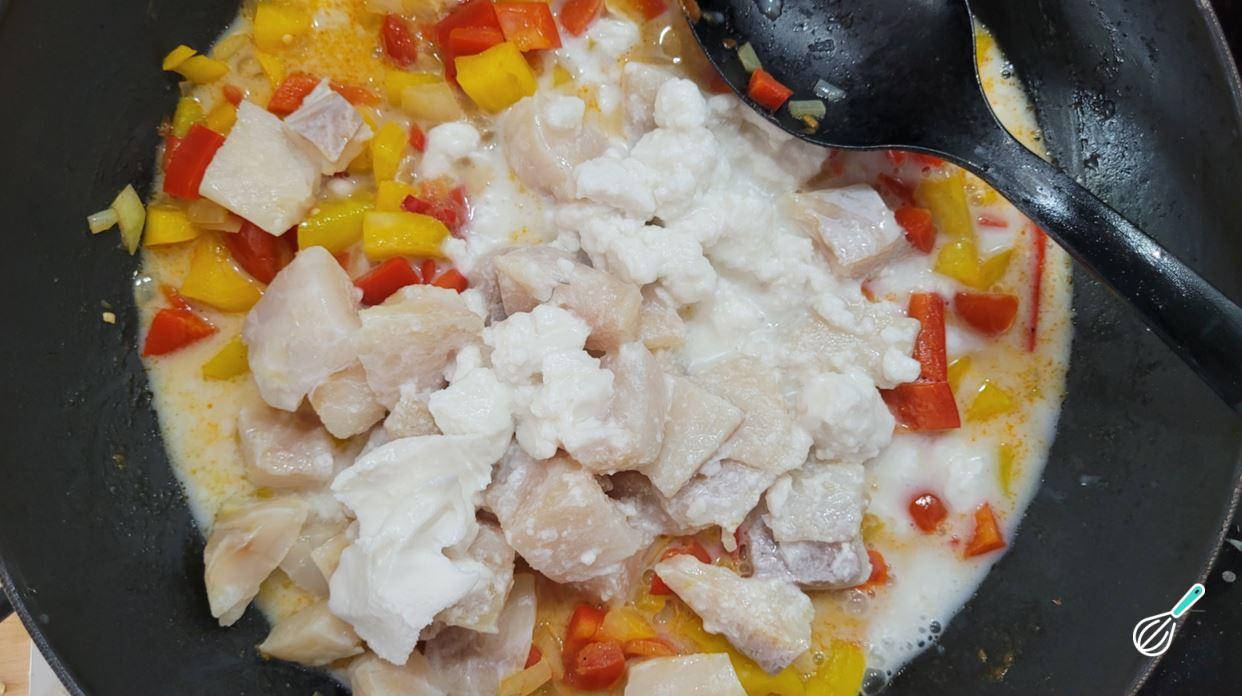 Quando o tomate estiver mais desmanchado, adicione o peixe e o leite de coco. Deixe cozinhar por alguns minutos. Dissolva o amido em 1 colher de sopa de água para que não empelote e coloque sobre a mistura.