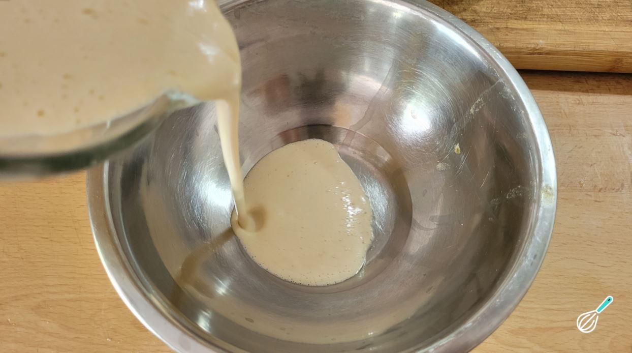 Transfira para uma tigela. A massa deve ficar mais líquida mesmo. Reserve e deixe descansar por pelo menos 15 minutos. Isso vai ajudar a farinha a absorver os líquidos e encorpar a massa.