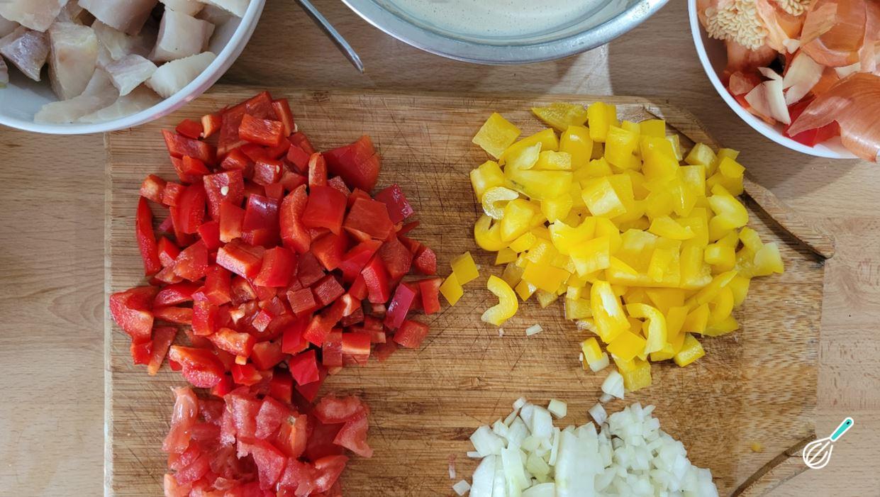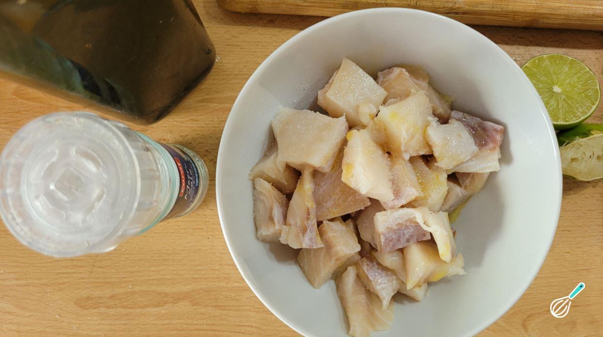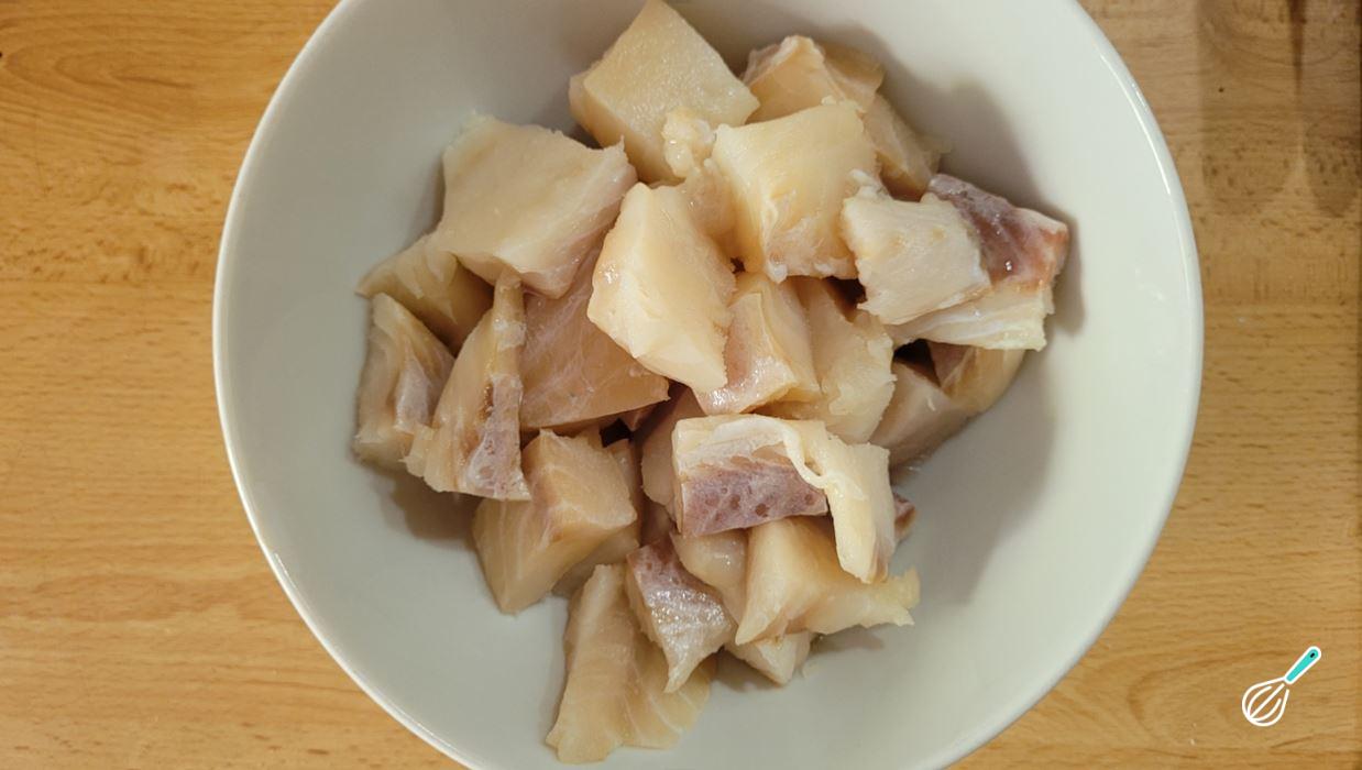 Enquanto isso, aproveite para preparar o recheio. Comece cortando o peixe em cubos e transfira para uma tigela.