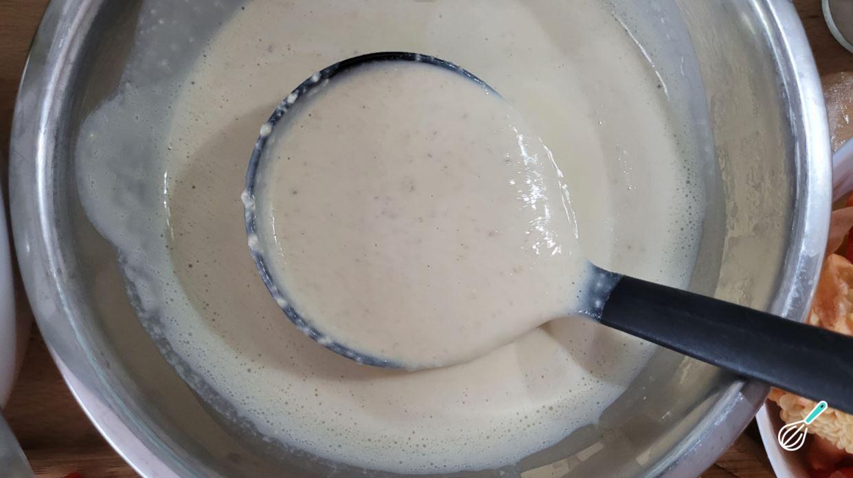 Depois do descanso, a massa deve estar um pouco mais encorpada, mas ainda é uma massa líquida. Pegue uma porção de massa com uma concha.