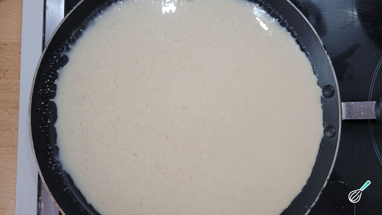 Espalhe bem a massa da panqueca de peixe formando uma camada fina e homogênea sobre o fundo. É muito mais fácil trabalhar com a frigideira ainda fria para espalhar a massa. Com a frigideira quente, a massa começa a endurecer muito rápido e é difícil espalhar homogeneamente.