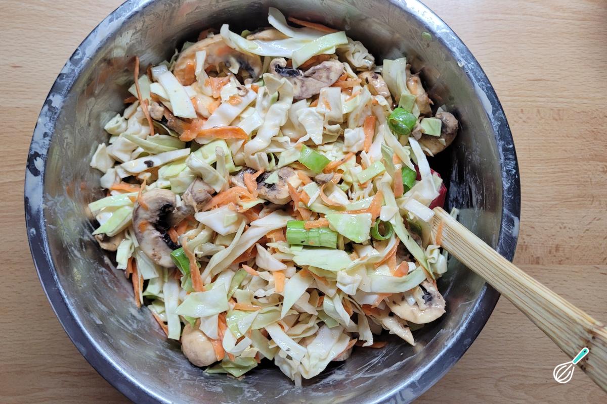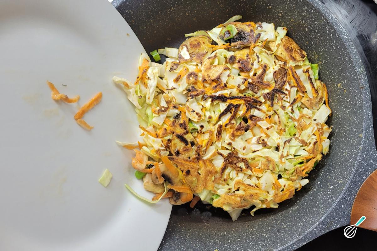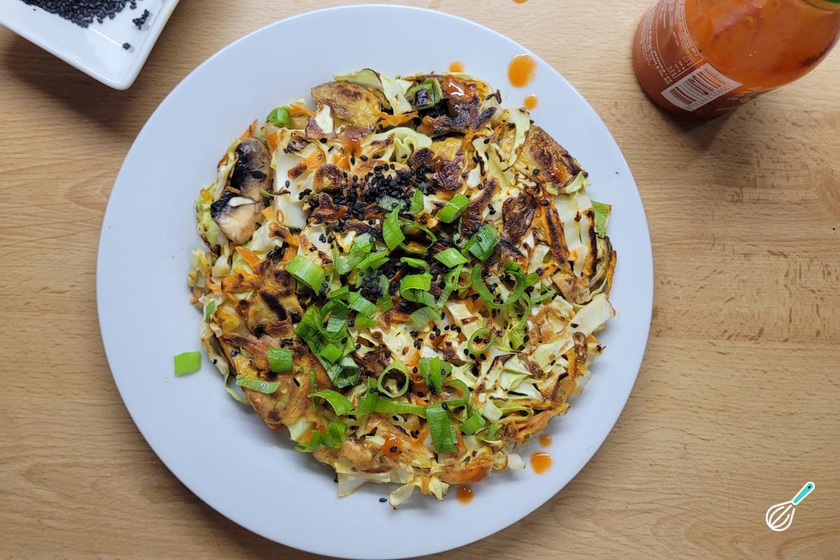 Inspirada em uma receita japonesa chamada Okonomyiaki, essa panqueca salgada de repolho é a receita perfeita para usar aqueles vegetais que estão sobrando na geladeira. O nome em japonês significa literalmente "o que você quiser grelhado", mostrando a versatilidade da receita que permite usar qualquer legume ou verdura que tiver sobrando. Adições comuns incluem repolho e cenoura, e aqui coloquei também cogumelos e cebolinha, mas você ainda pode incluir carnes e frutos do mar.