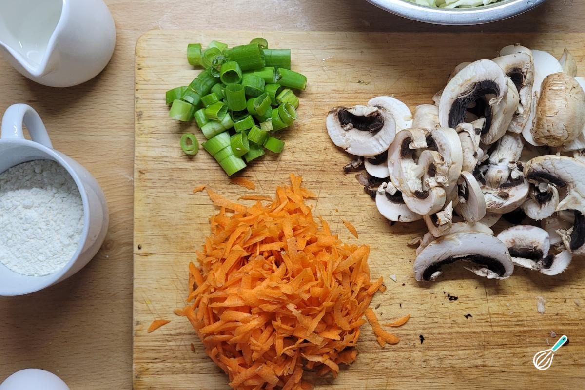 Rale a cenoura no ralo grosso do ralador, corte os cogumelos em fatias e corte a cebolinha. Reserve os vegetais cortados.