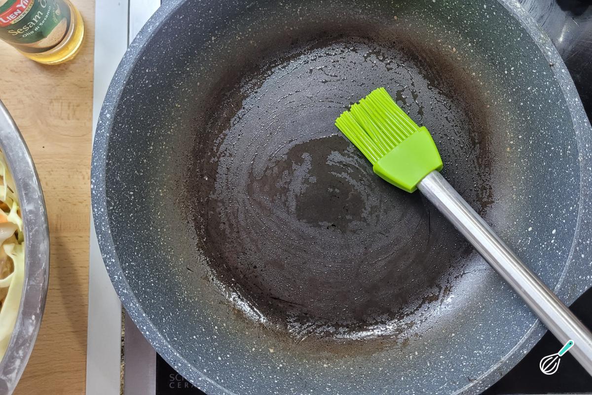 Em uma frigideira antiaderente, espalhe bem um fiozinho de óleo de gergelim. Se não tiver óleo de gergelim, substitua por algum óleo neutro.