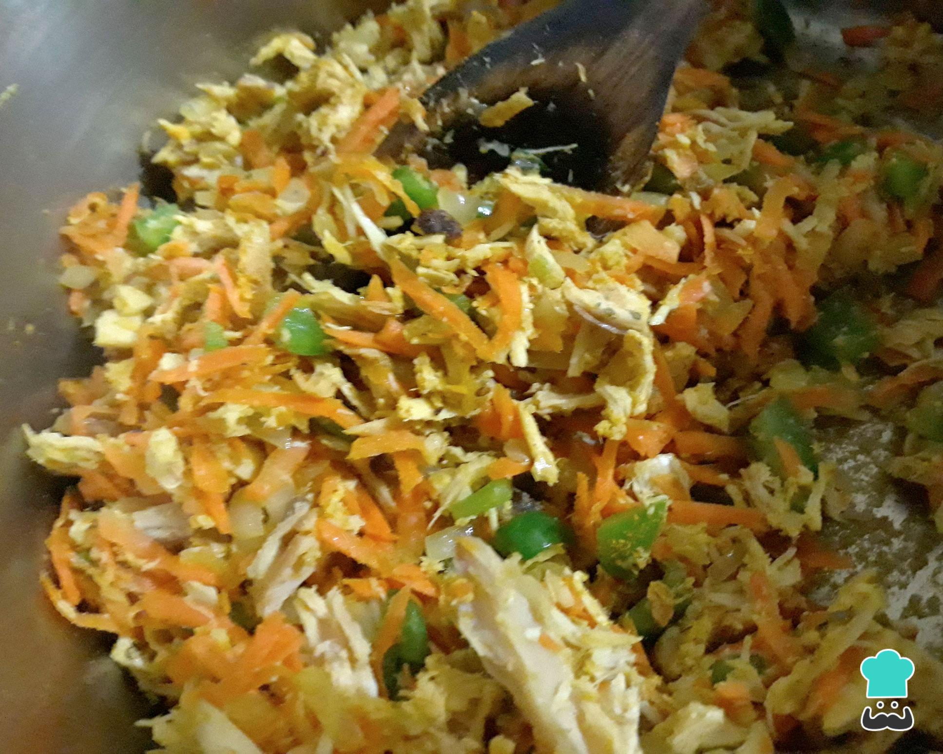 Coloque a ervilha e a cenoura, misture e deixe por mais 2 minutos. Adicione o molho de tomate, para conseguir um recheio de frango cremoso, e deixe no fogo até secar um pouco o molho. Depois desligue o fogo e reserve esse recheio.