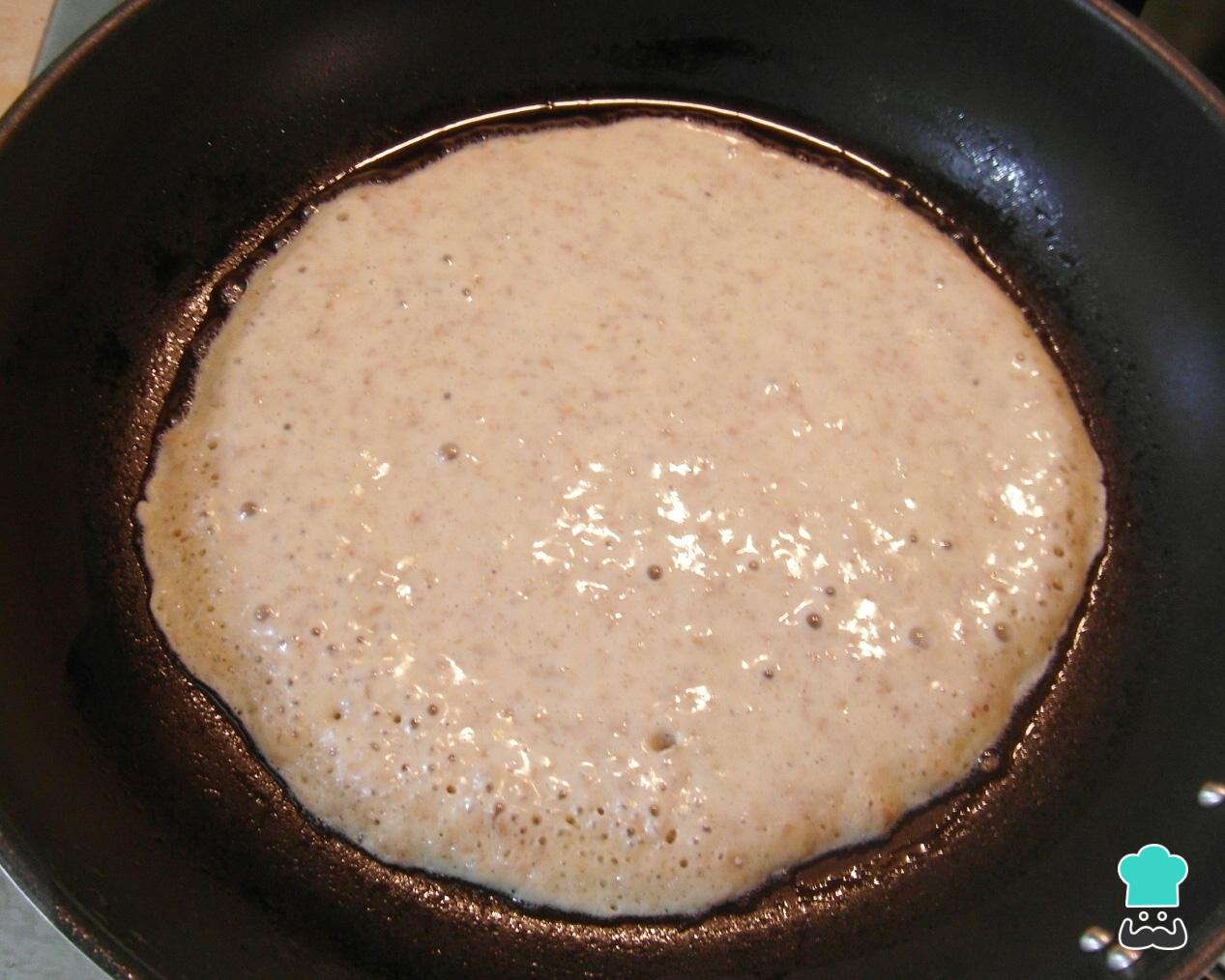 Leve ao fogo uma frigideira antiaderente e despeje 1 concha da massa integral. Espere ficar consistente, depois vire e deixe dourar do outro lado também. Retire para um prato e repita este procedimento até cozinhar toda a massa de panqueca.