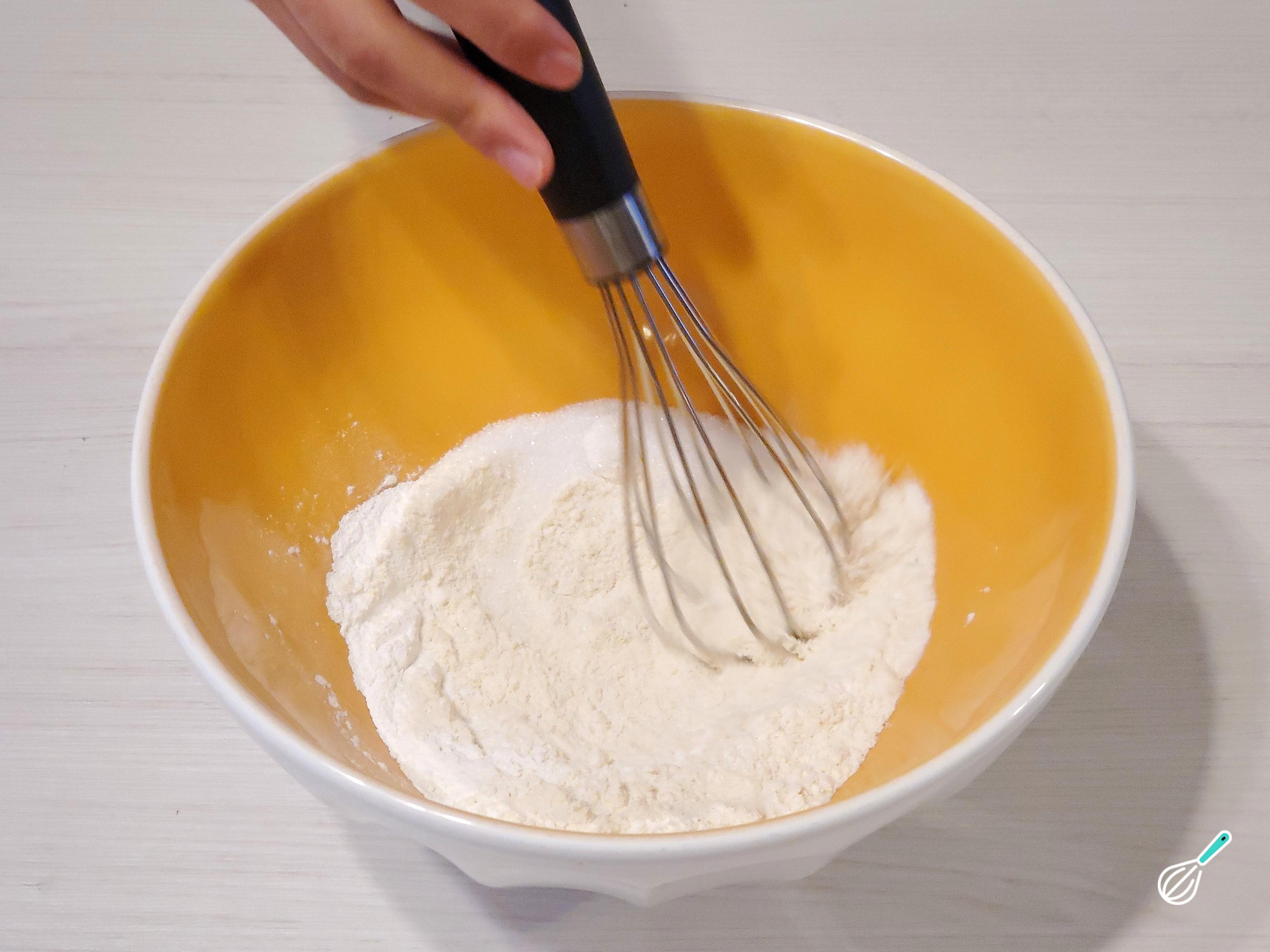 Em uma tigela um pouco maior, despeje a farinha, o açúcar, uma pitada de sal e o fermento, e mexa com o batedor. Se desejar, nesta altura pode temperar a massa com especiarias em pó como canela, gengibre, cravo-da-índia, noz-moscada, cacau, café e/ou outras de sua preferência.