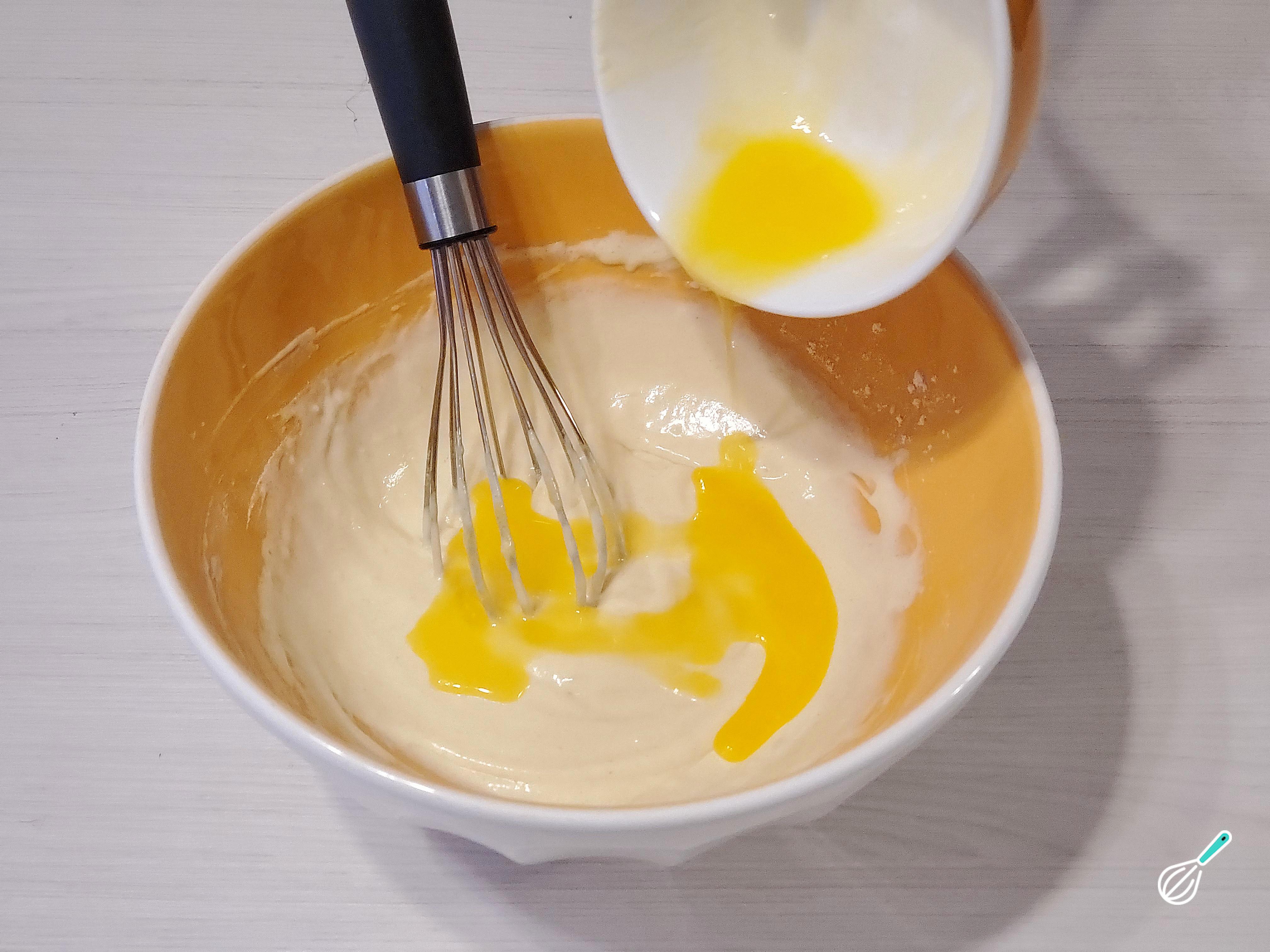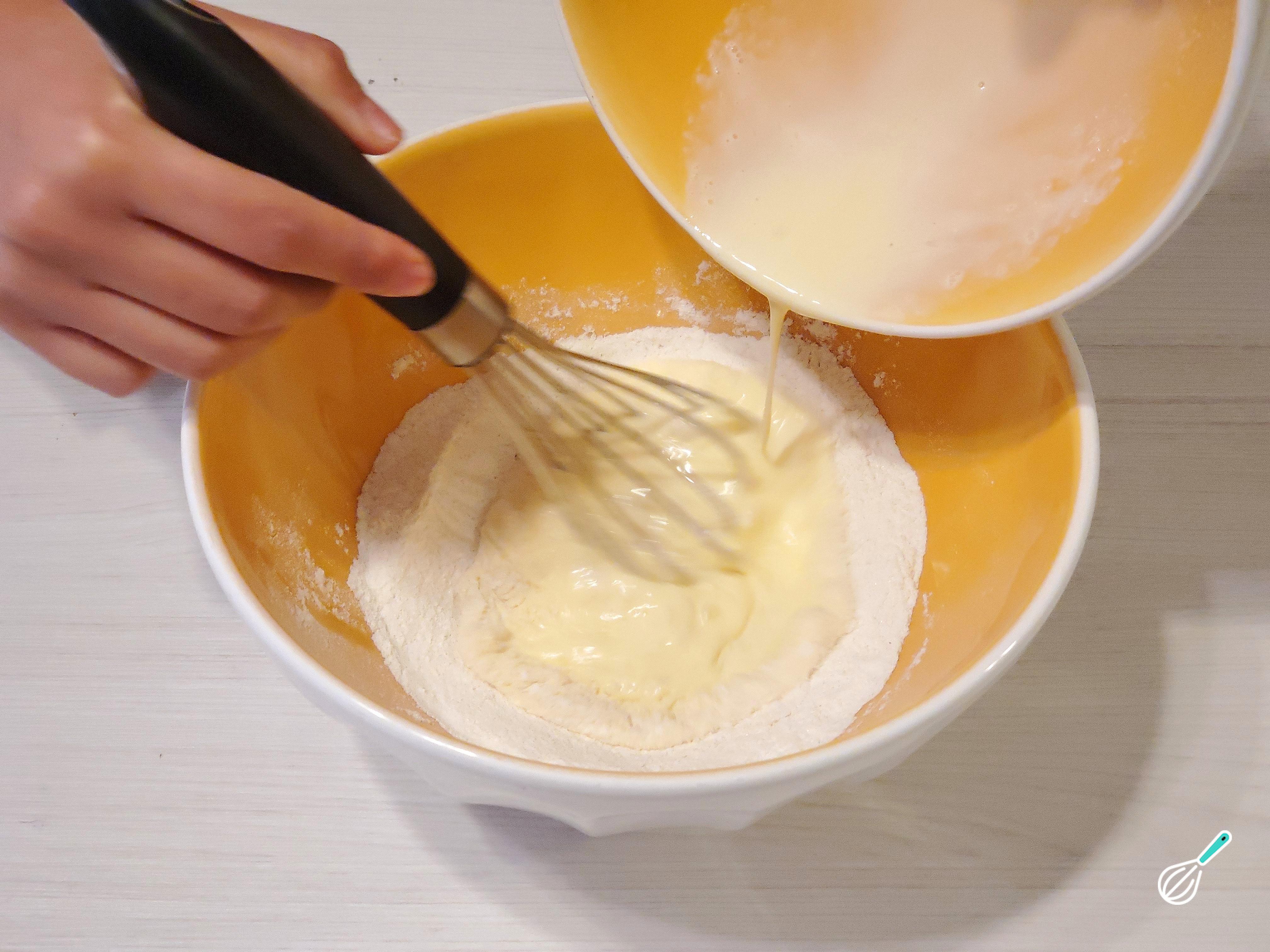 No centro destes ingredientes secos faça um buraco e despeje a mistura de ingredientes líquidos. Com o batedor, misture do centro para fora até obter uma massa homogênea e sem grumos.