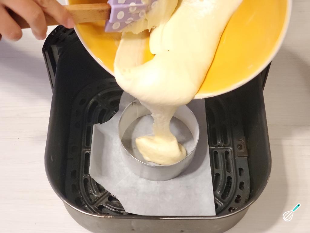 Passado o tempo de descanso, coloque alguns pequenos moldes ou anéis de silicone para panquecas em papel manteiga na cesta da airfryer. Em seguida, despeje a massa até ficar com 1 dedo de espessura e comece a cozinhar a 175°C por 8 a 10 minutos.