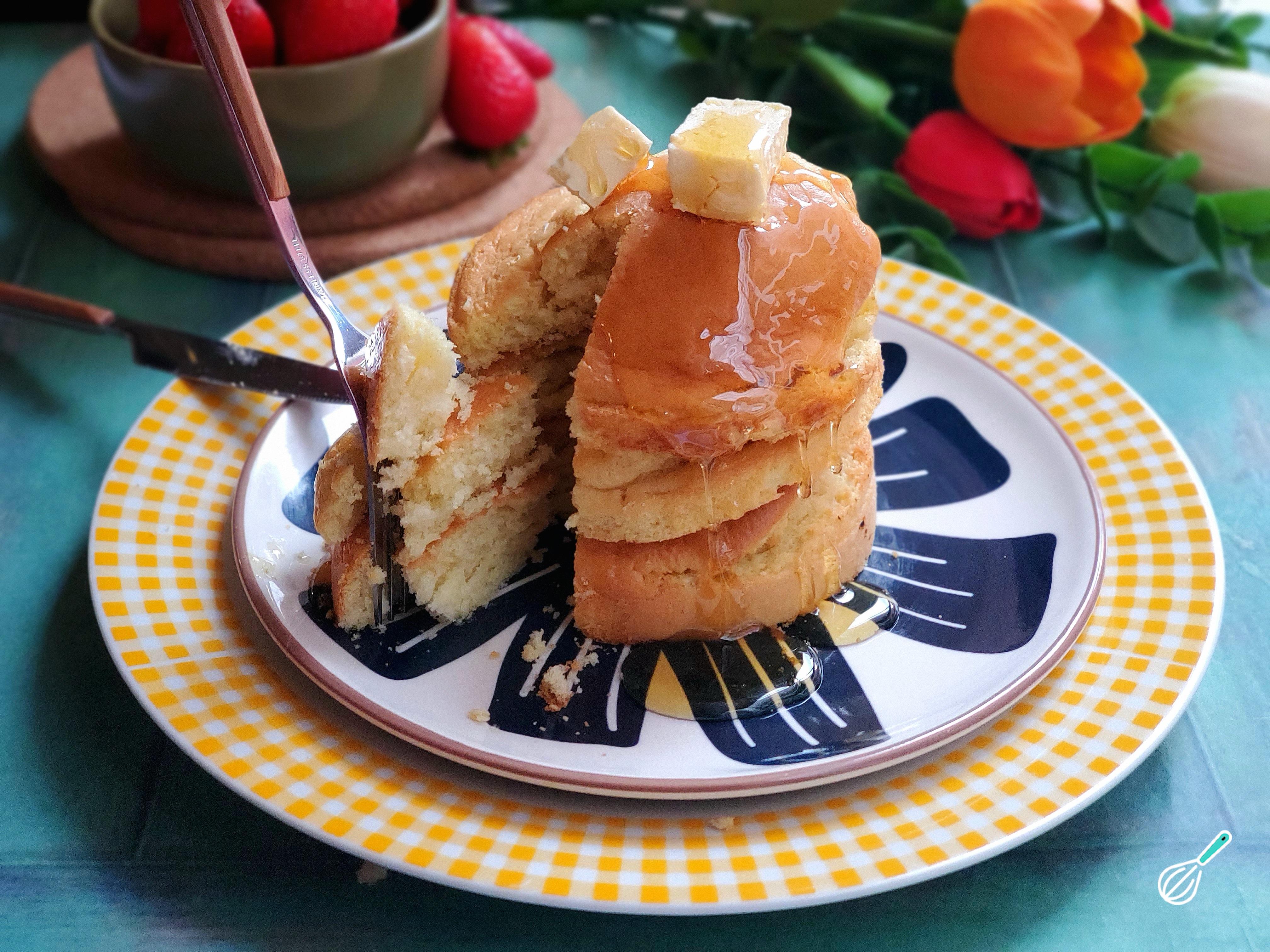 Panquecas são massas cozidas em uma frigideira, daí o nome em inglês "pan" frigideira e "cake" bolo. Da mesma forma, esta receita é muito fácil de preparar, por isso hoje você encontramos uma infinidade de variações, por exemplo, a que mostraremos a seguir não exige que você teste suas habilidades virando a panqueca no ar, basta programar a fritadeira e pronto. Você pode preparar a massa com farinha, leite, ovo, manteiga, açúcar e fermento em pó, mas também pode usar uma mistura pronta para panquecas.