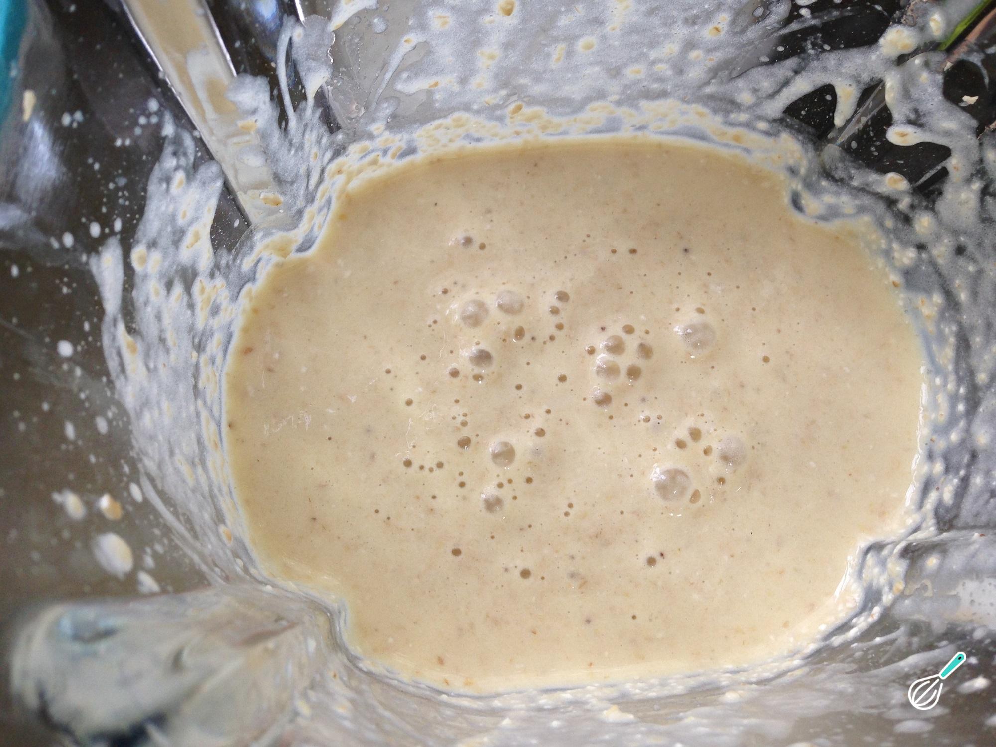 Se você quiser fazer as panquecas no liquidificador, coloque aí as bananas em purê junto com os ovos, a canela, metade do óleo de coco e, se quiser, a farinha de amêndoas. Bata tudo muito bem.