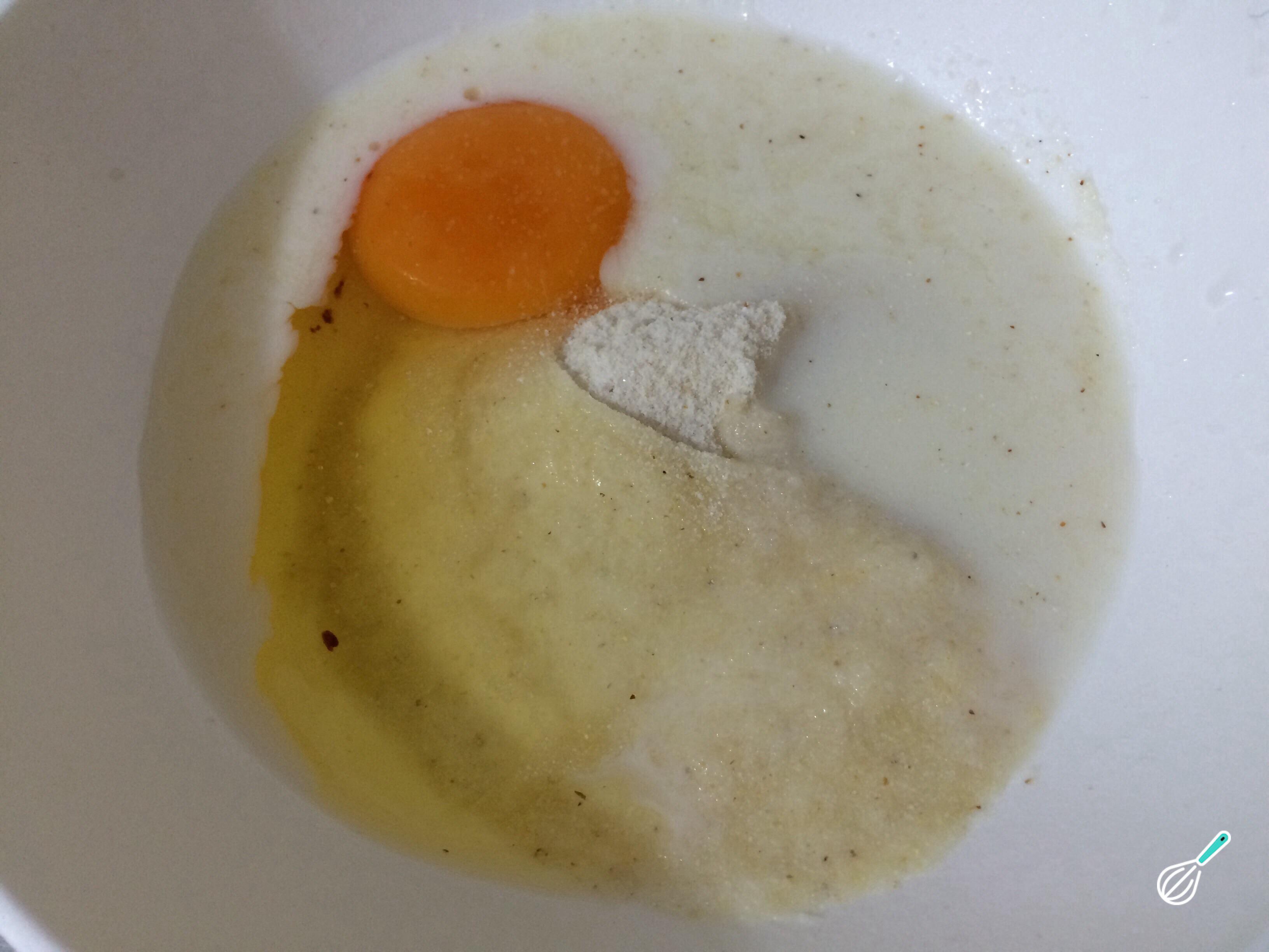 Prepare a massa das panquecas misturando em uma tigela o ovo, o leite, a farinha e uma pitada de sal.