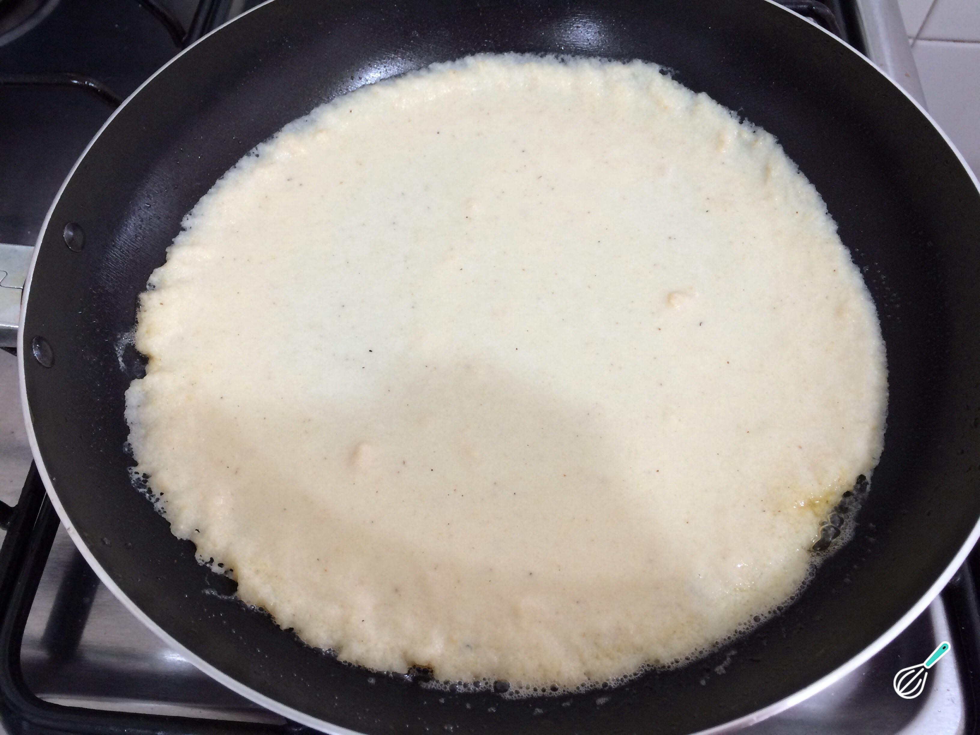 Unte uma frigideira antiaderente com um pouco de óleo, e coloque aí uma concha de sopa da massa anterior. Distribua bem, agitando a frigideira, e cozinhe cada lado em fogo baixo durante cerca de 2 minutos.