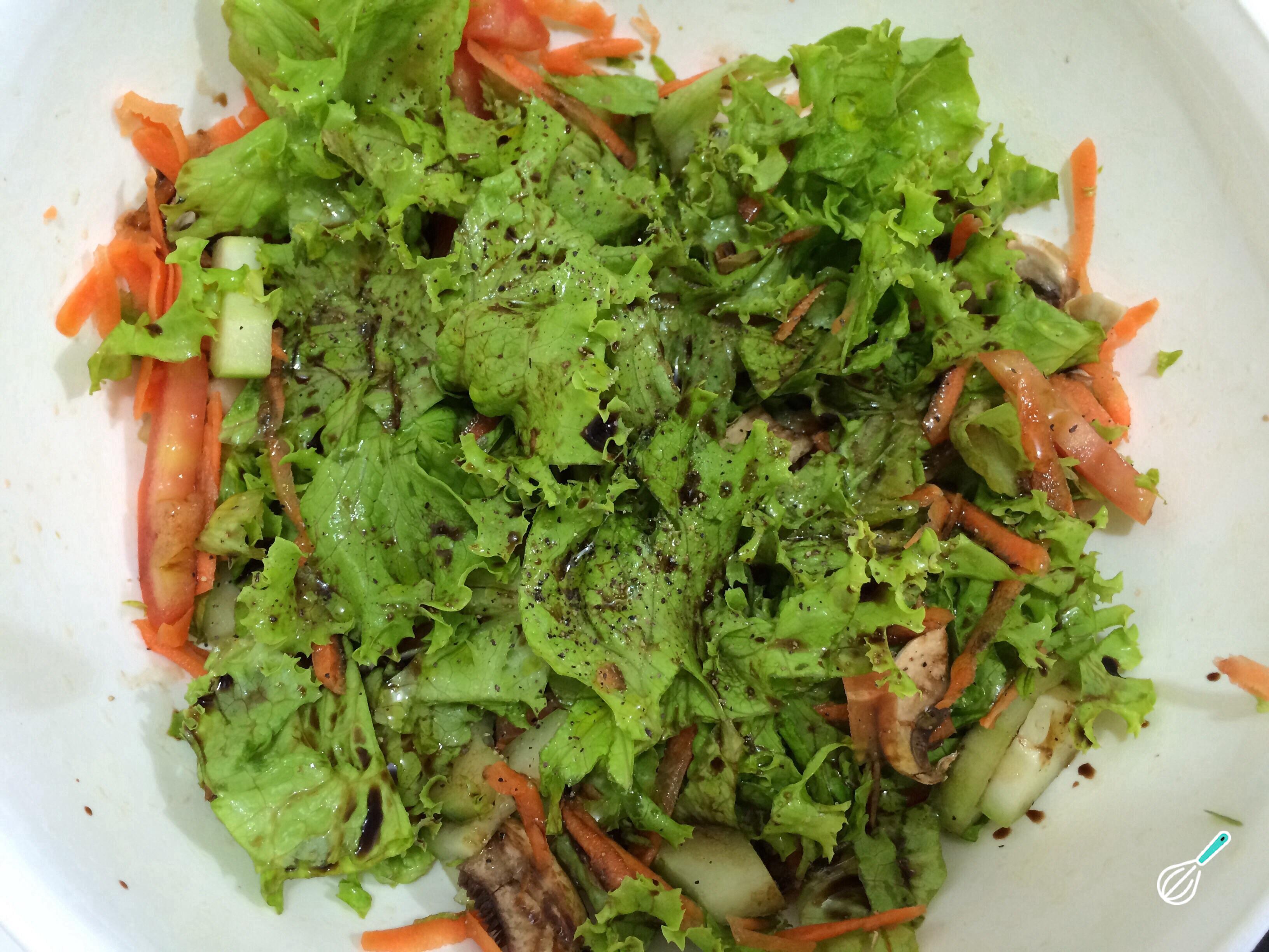 Tempere a salada com o vinagre balsâmico, o azeite de oliva, sal e pimenta a gosto e misture tudo muito bem.