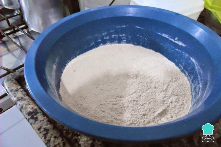 Para preparar esta panqueca sem ovo comece por misturar numa tigela os ingredientes secos: farinha, fermento, açúcar e sal.