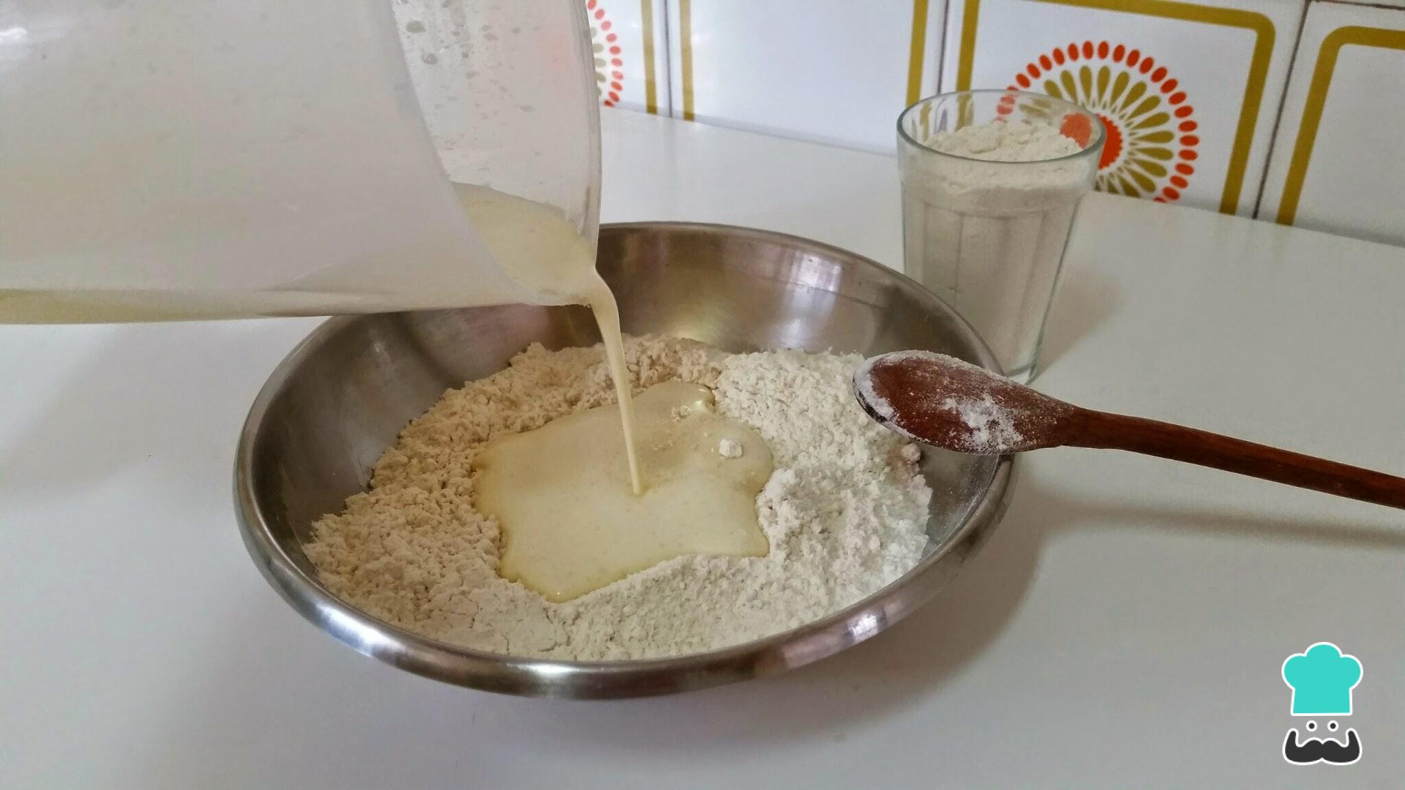 Num recipiente à parte misture os ingredientes líquidos (óleo, leite e essência de baunilha) e acrescente-os aos anteriores enquanto mexe, para evitar que se formem grumos.
