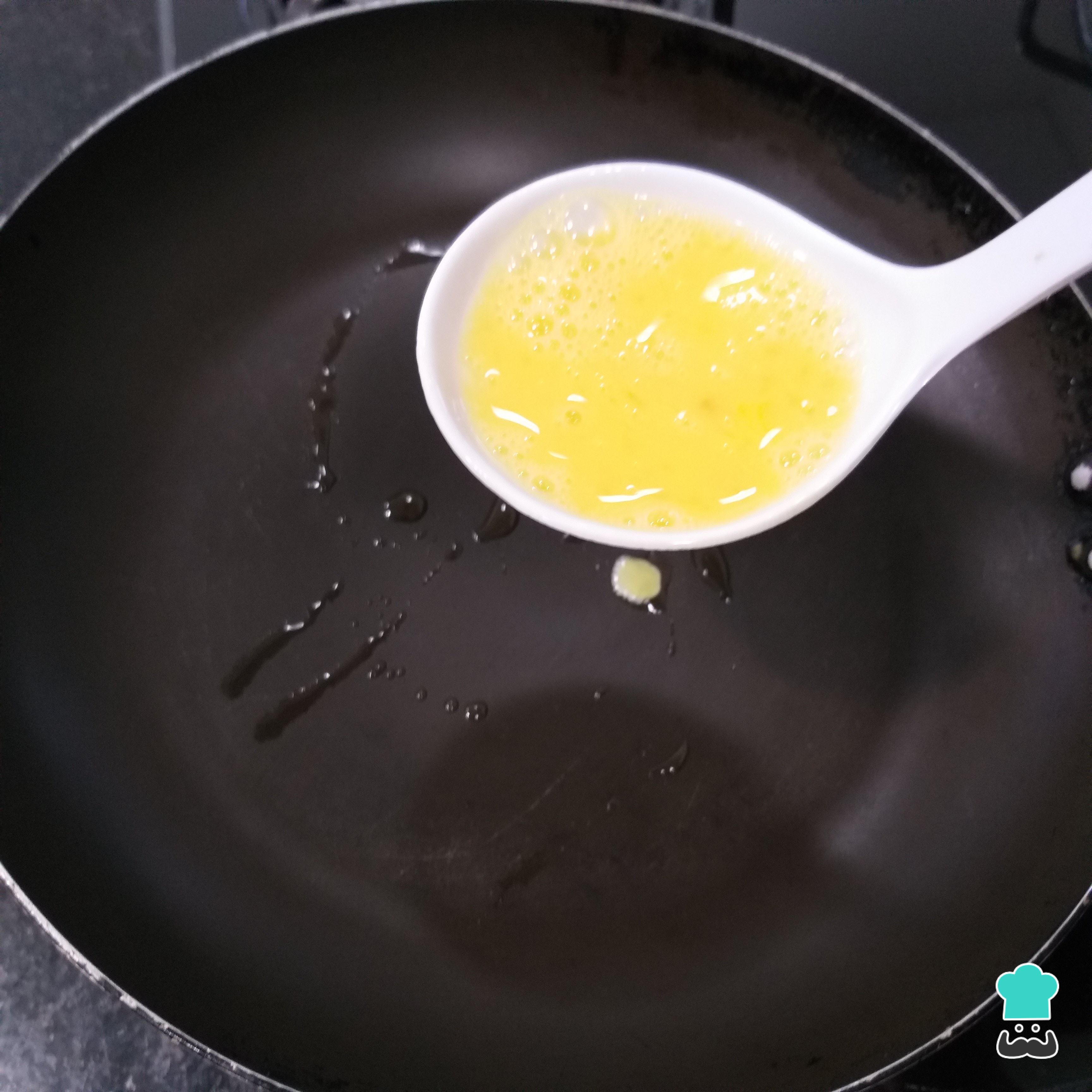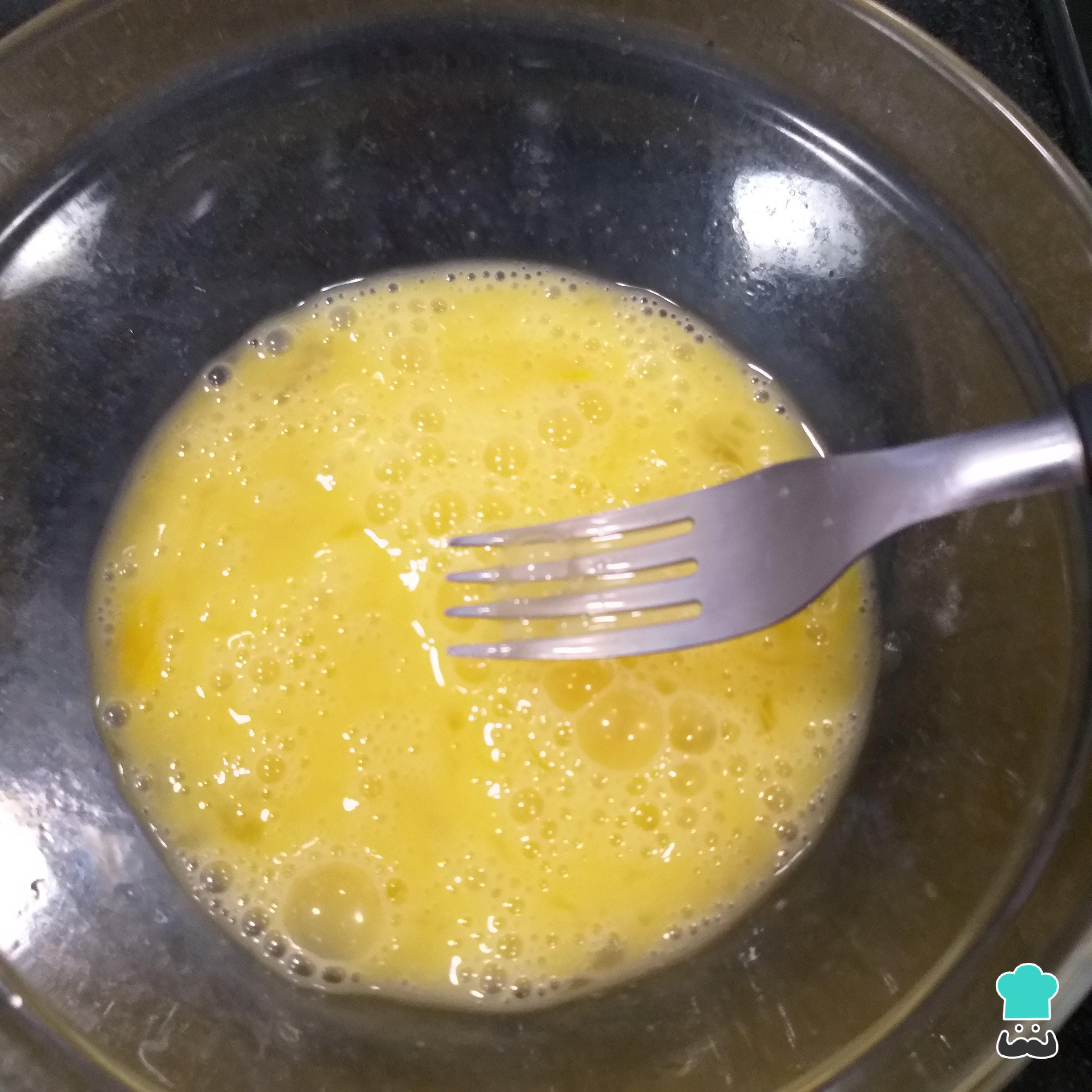 Misture o ovo, as claras e o sal num recipiente. Pode misturar simplesmente usando um garfo, não precisa da batedeira nem do liquidificador ou mixer.