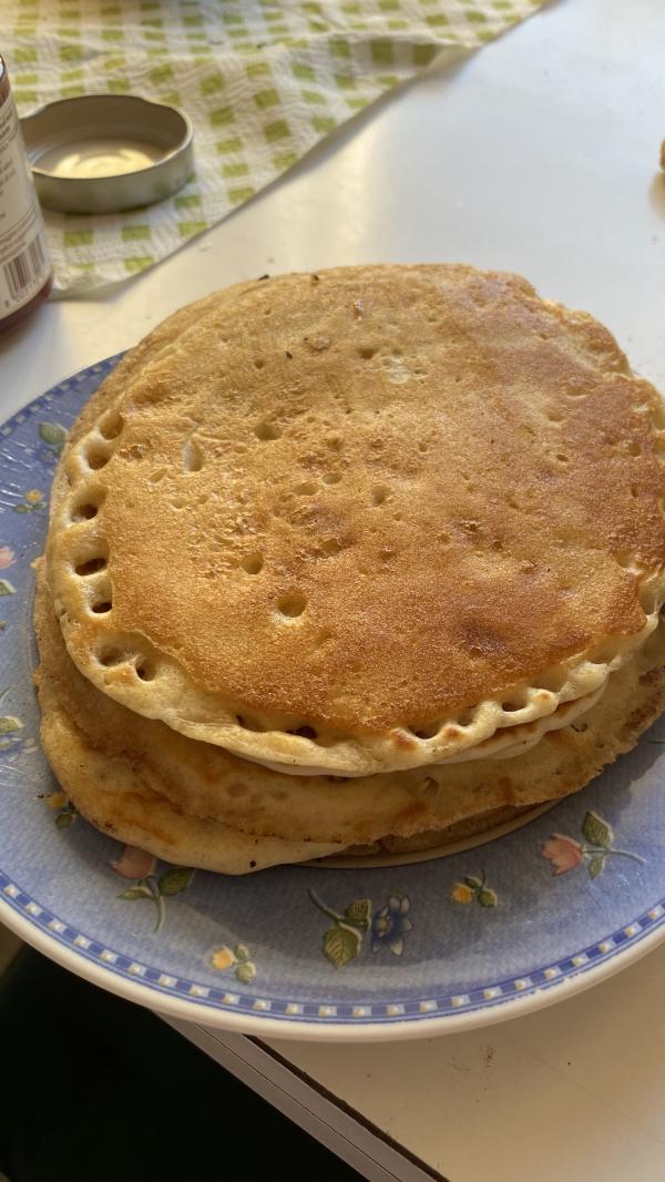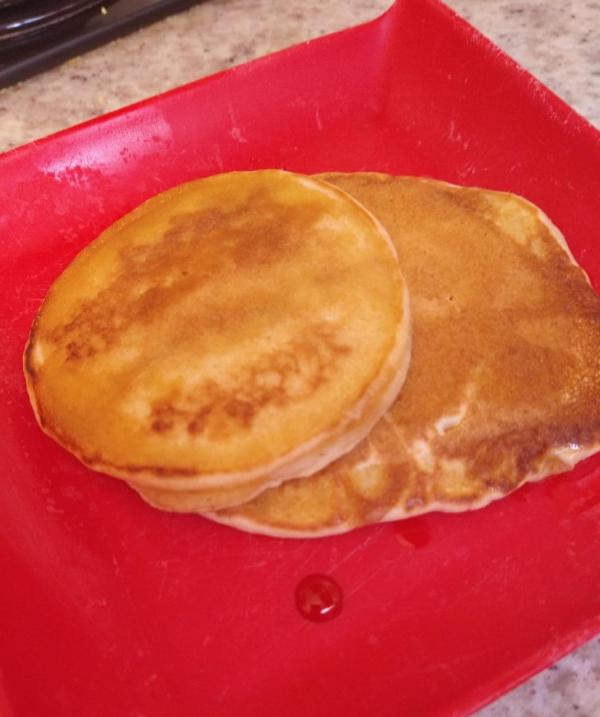 Quando a panqueca americana sem ovos estiver dourada de ambos os lados, retire para um prato e repita o procedimento com a massa restante. Sirva em seguida acompanhadas de fruta ou mel. Bom apetite!