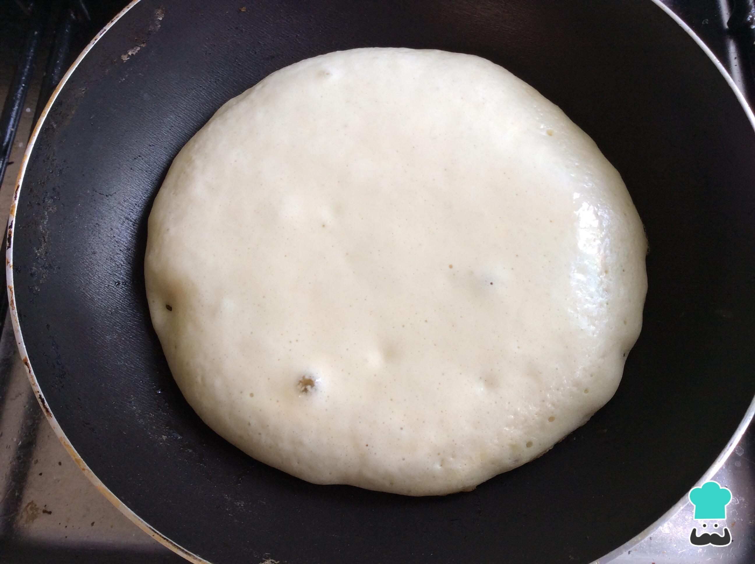 Em uma frigideira quente com um pouco de óleo, adicione uma porção da massa das panquecas americanas sem ovos e deixe que se espalhe. Cozinhe em fogo médio até começar borbulhando e, nesse momento, vire ao contrário usando uma espátula.