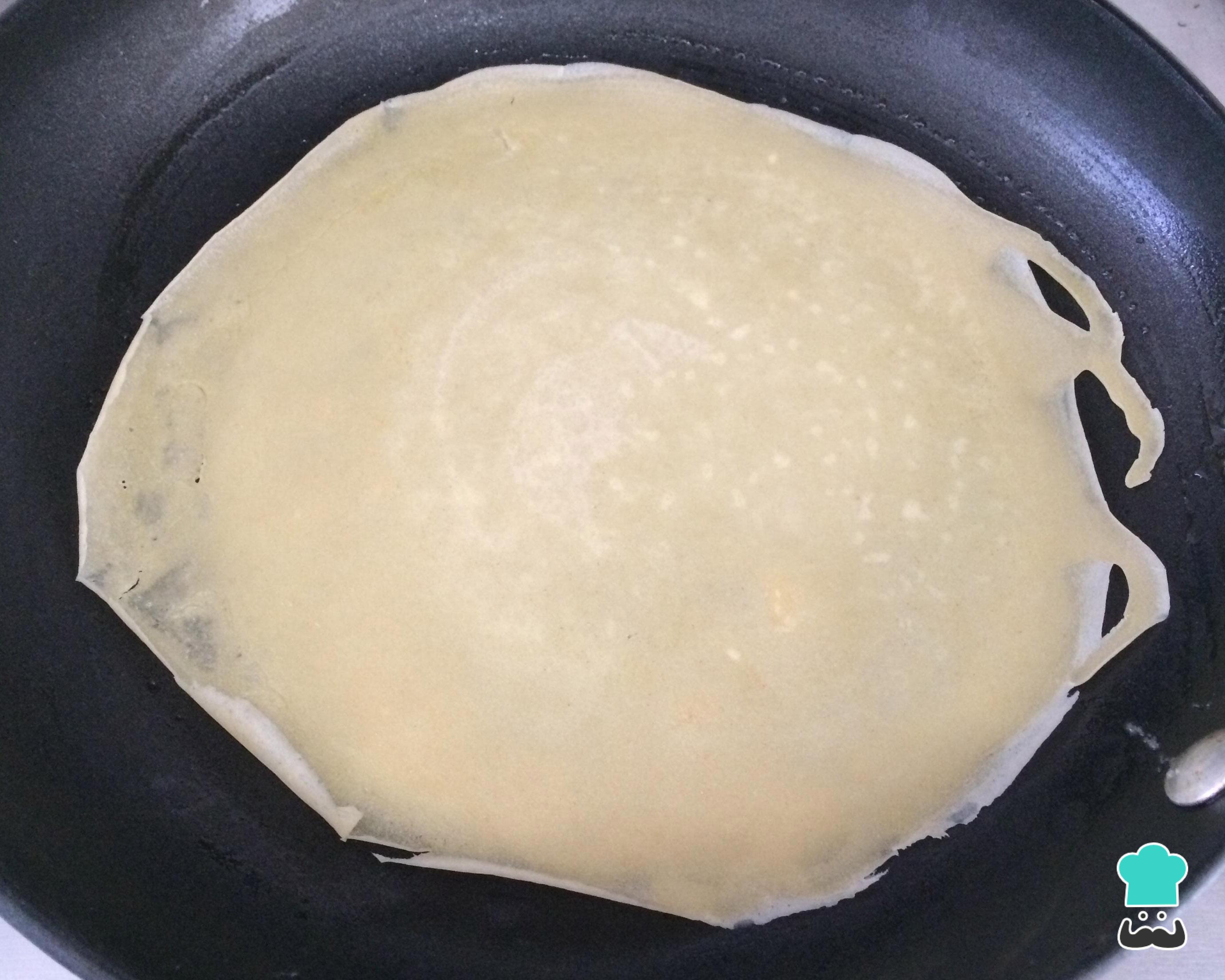 Vire a panqueca de farinha de arroz e deixe por mais uns segundinhos, para cozinhar do outro lado também. Retire para um prato e repita com a massa restante, untando a frigideira de novo, se necessário.