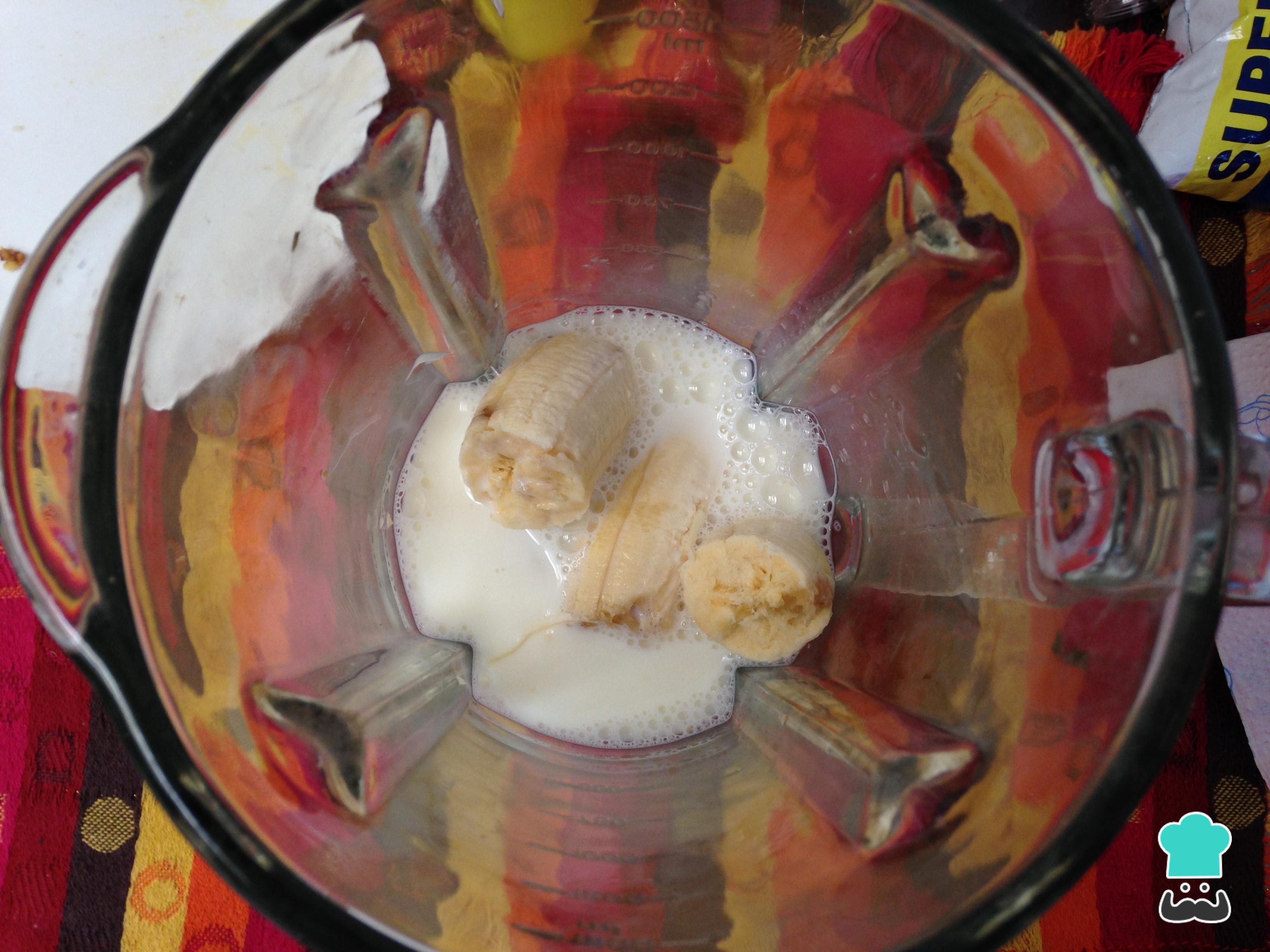 Descasque a banana e coloque-a no liquidificador junto com o leite. Bata até obter uma mistura mais ou menos homogênea.