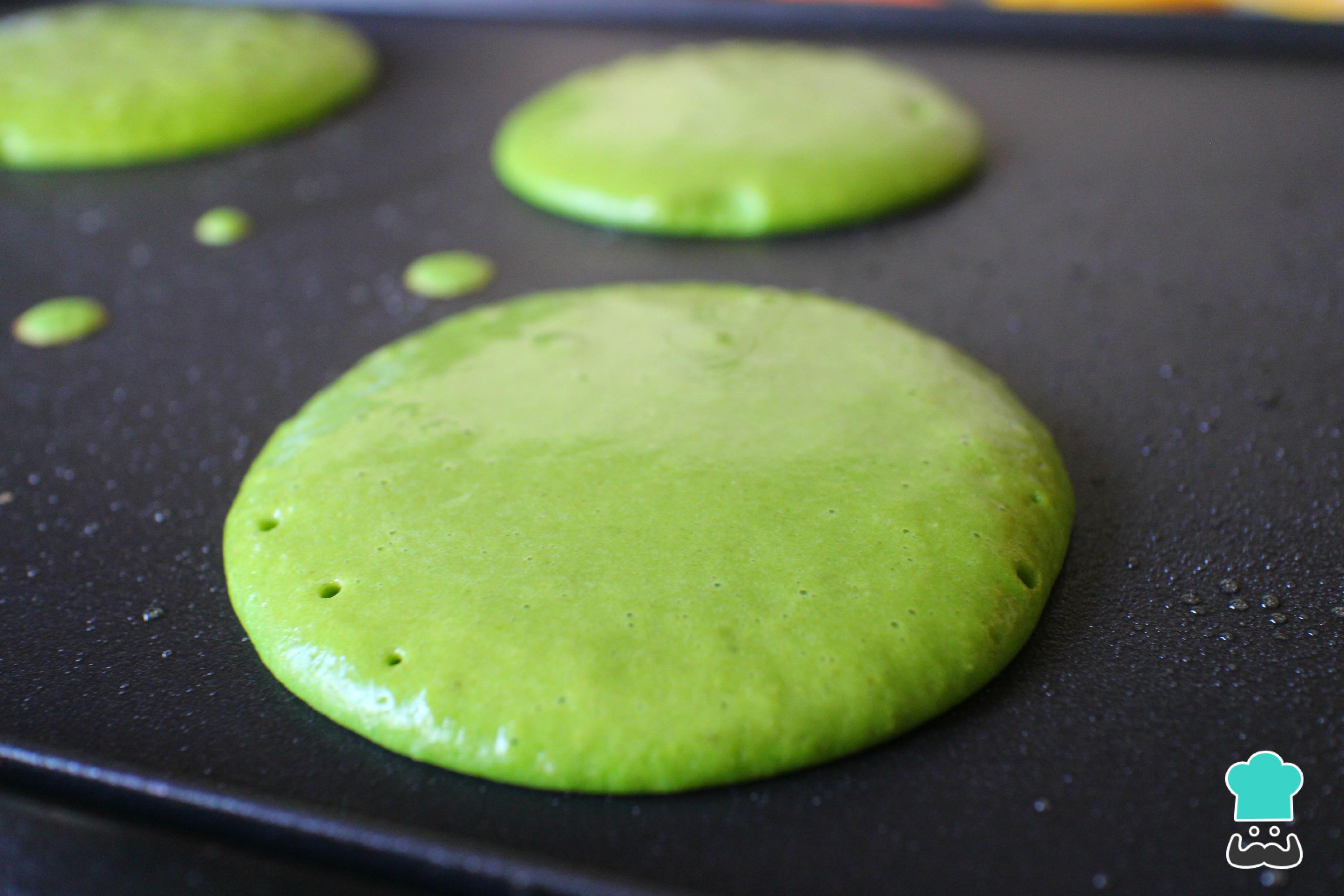 Unte uma frigideira com óleo e leve ao fogo médio. Quando estiver quente, coloque uma concha da massa da panqueca de espinafres e deixe fritar até borbulhar.