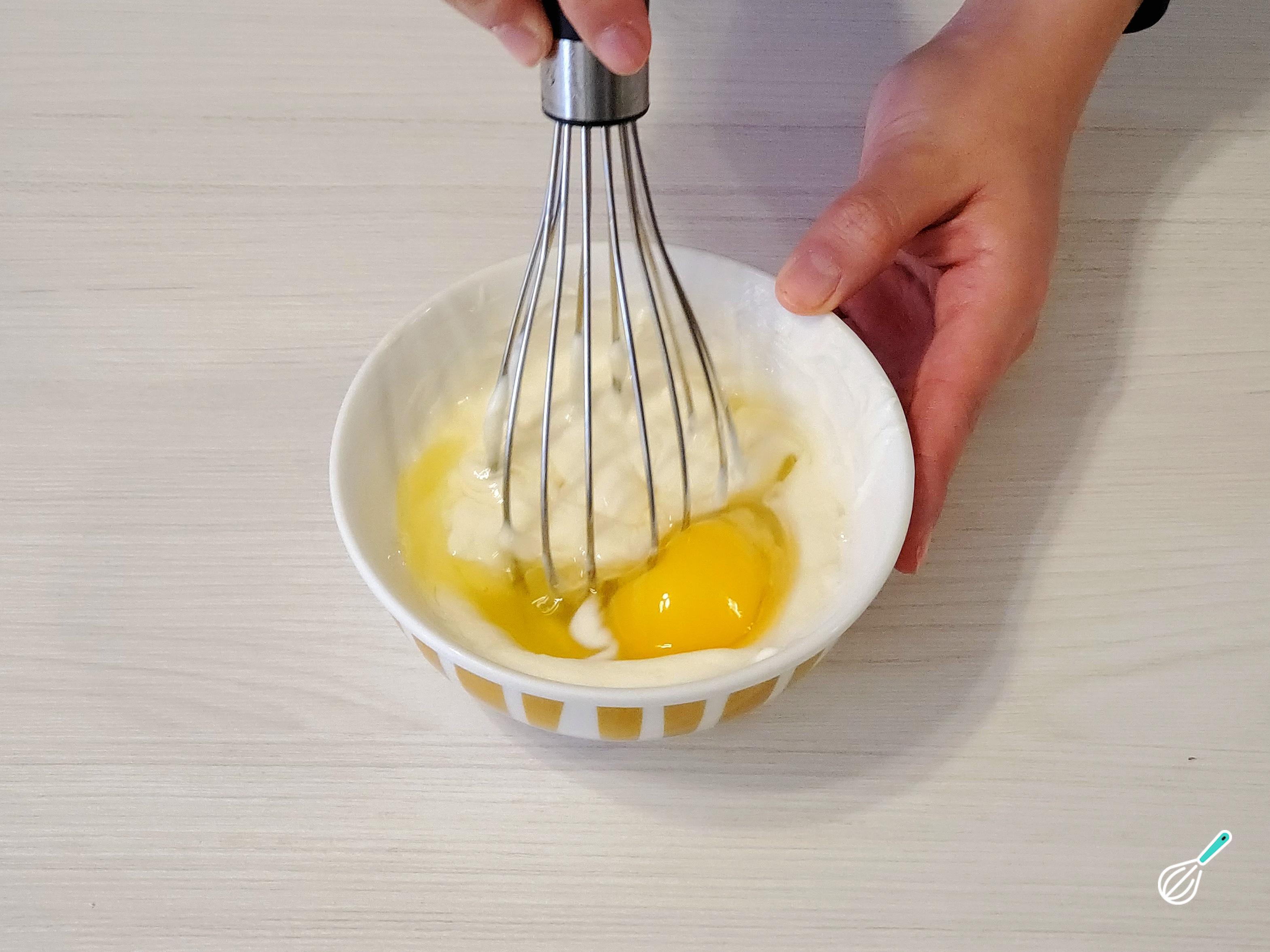 Comece por misturar os ovos com o iogurte grego e o leite , use um batedor para obter uma mistura homogênea. Reserve.