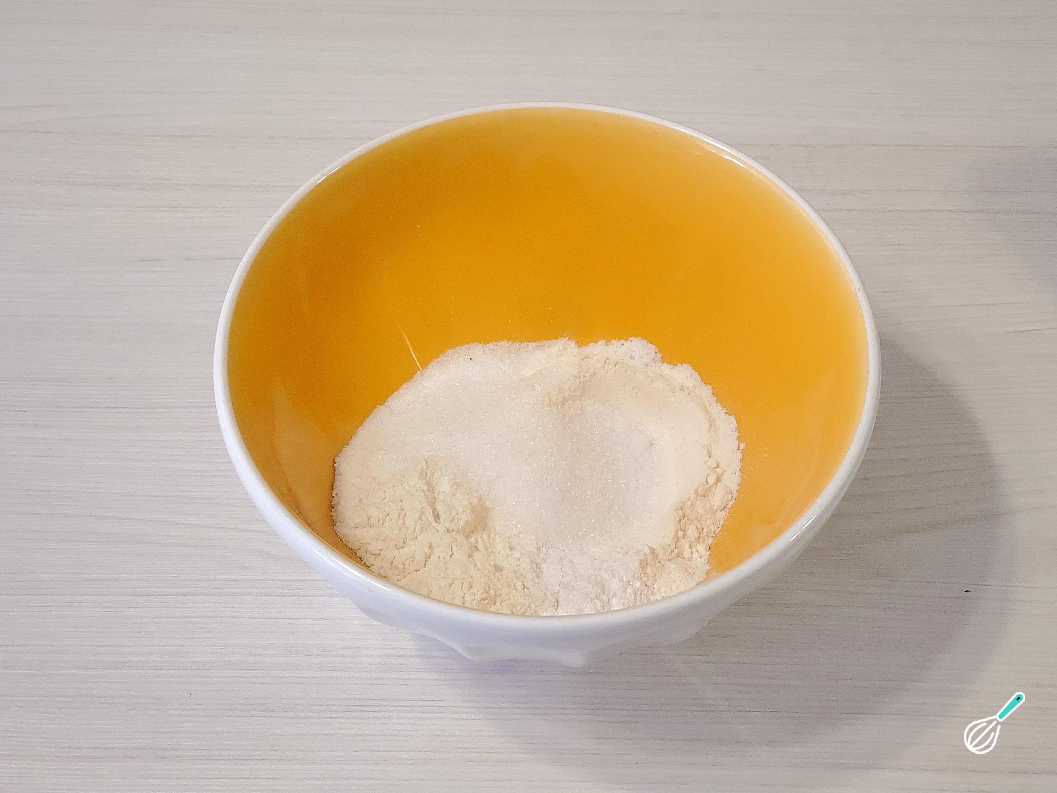 À parte, peneire a farinha em uma tigela grande e acrescente o restante dos ingredientes secos, que são o fermento, uma pitada de sal e o açúcar.