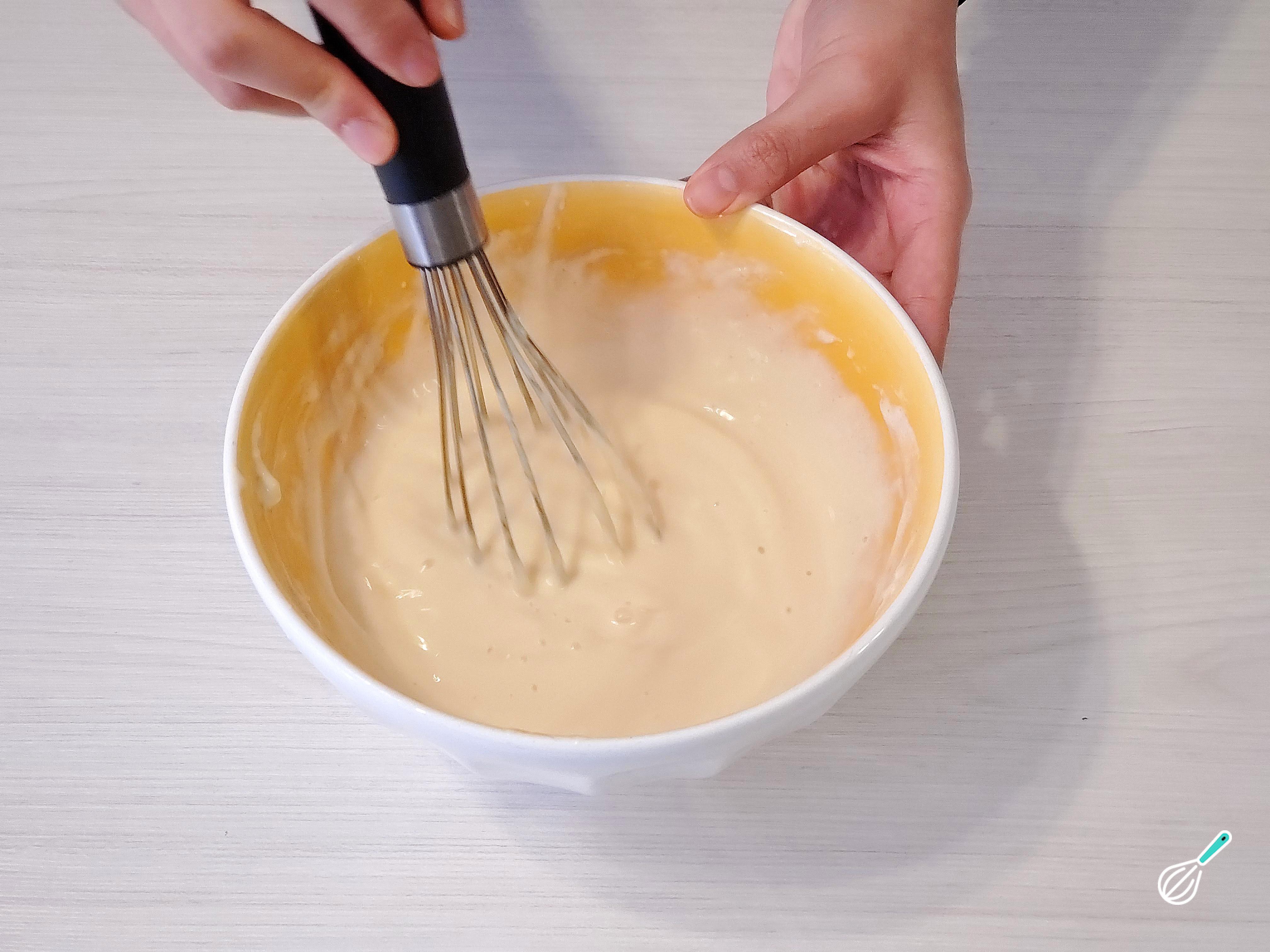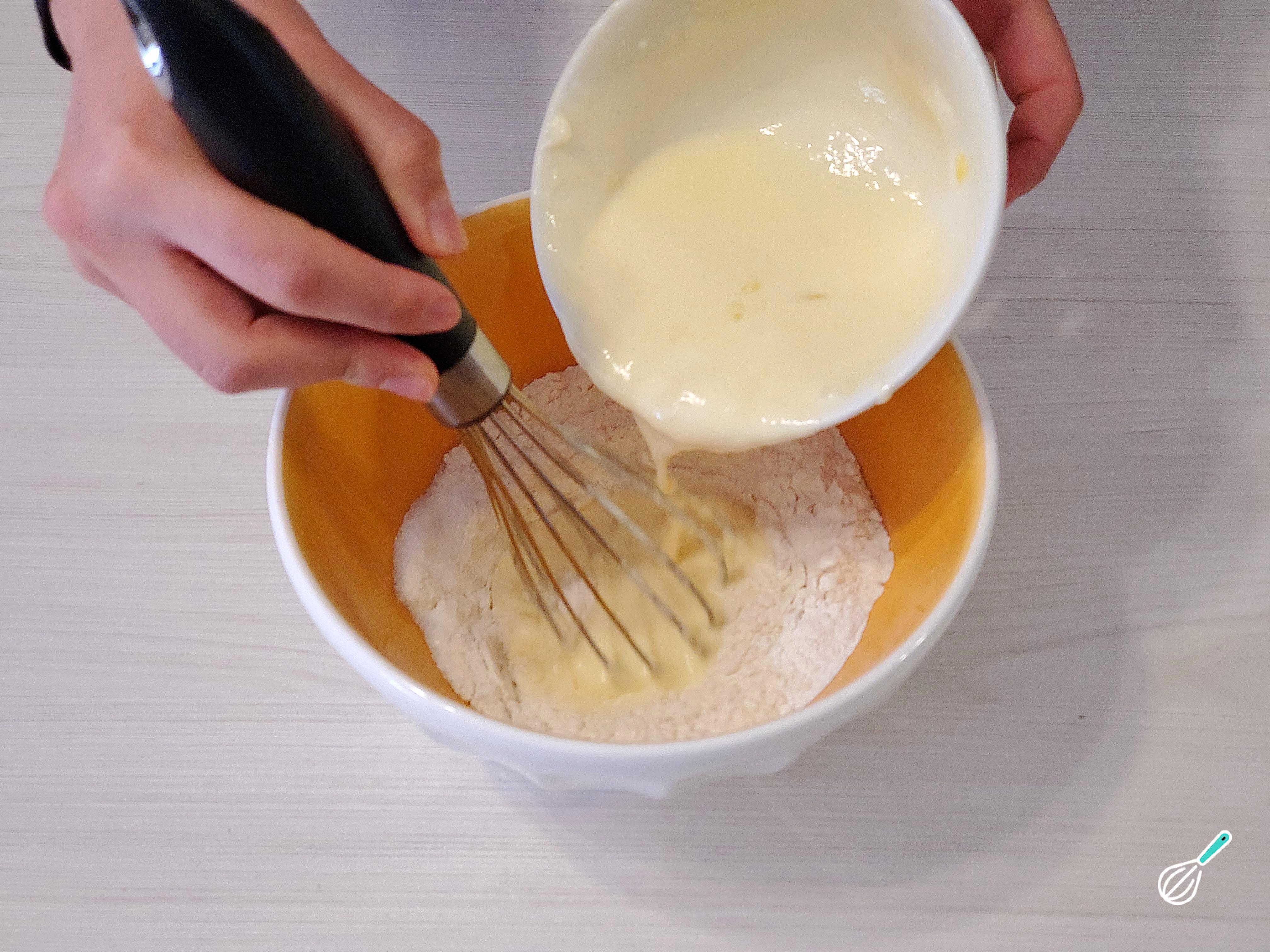 No centro despeje aos poucos a mistura de ingredientes líquidos mexendo com o batedor. Bata do centro para fora até que todos os grumos se dissolvam e obtenha uma mistura homogênea.
