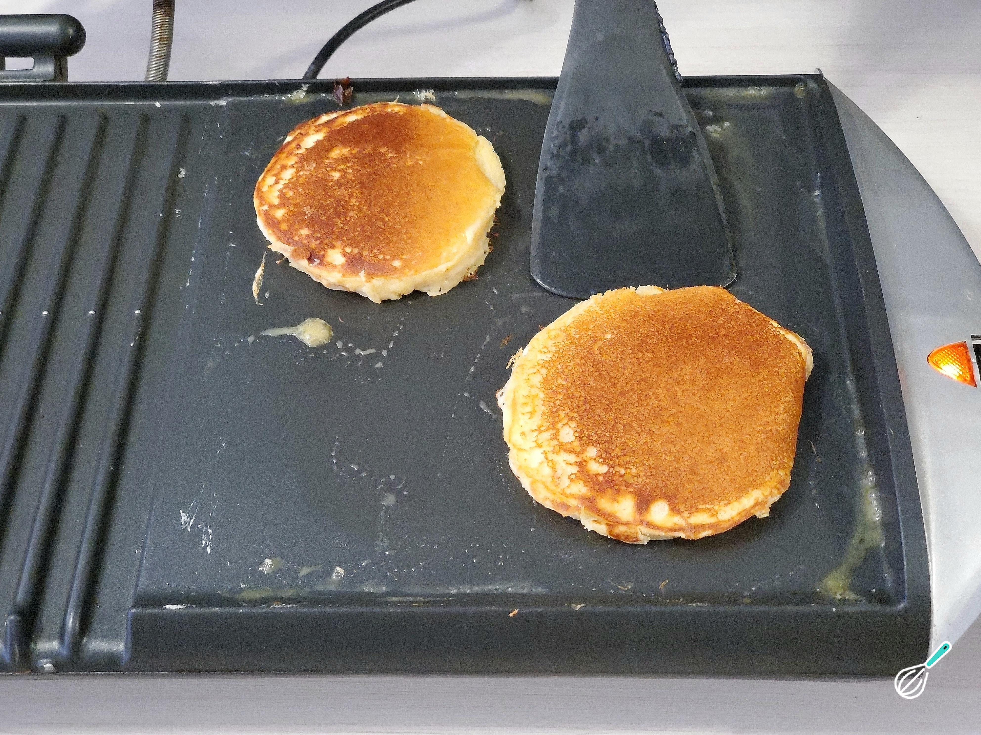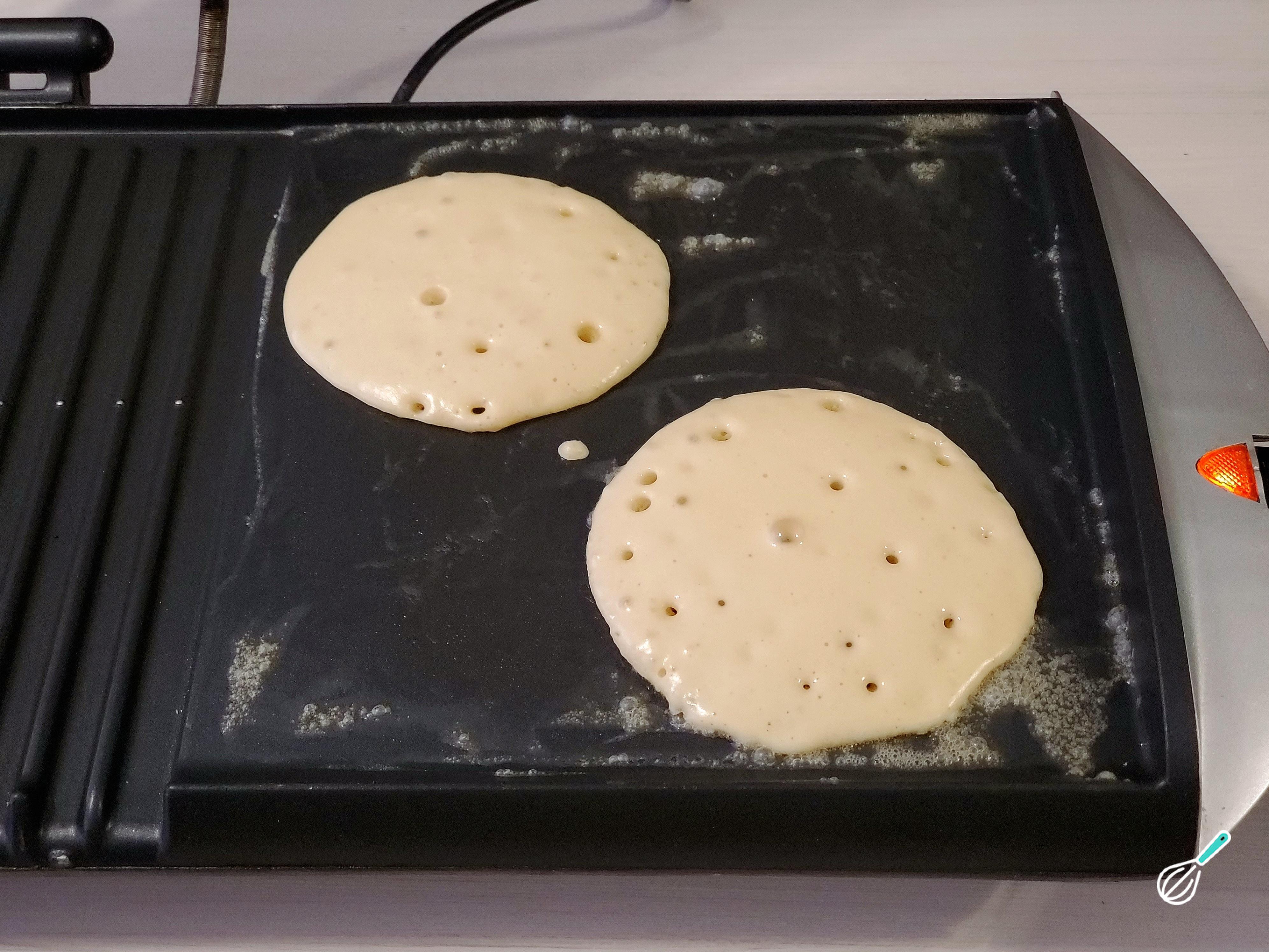 Deixe cozinhar em fogo médio-baixo até começarem a borbulhar. Em seguida, insira rapidamente uma espátula sob a panqueca e vire-a.