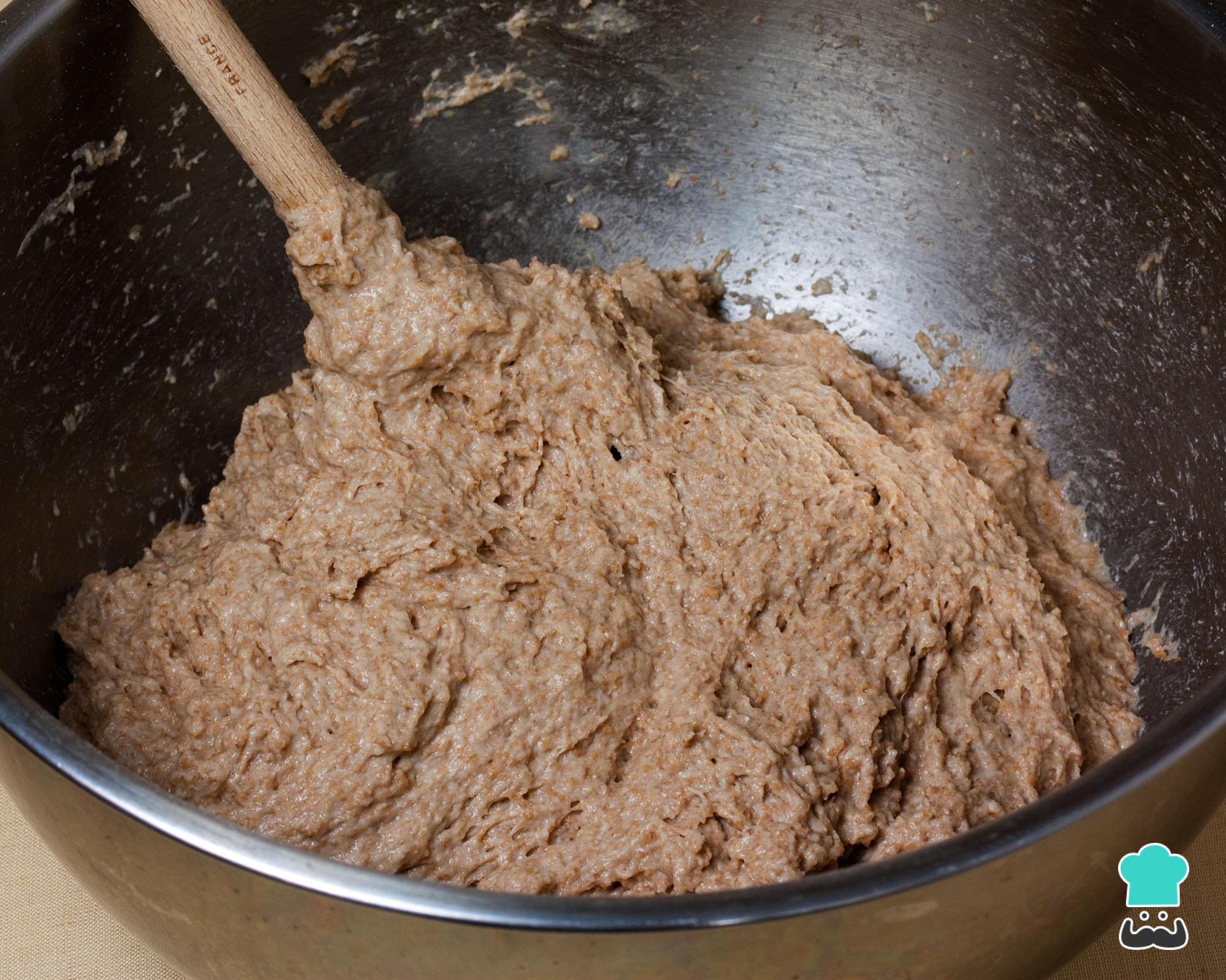 Numa tigela coloque os ingredientes secos: a farinha integral, o centeio, o sal e as sementes. Adicione a água com o fermento, o óleo, o ovo levemente batido e o mel e misture tudo com uma colher.