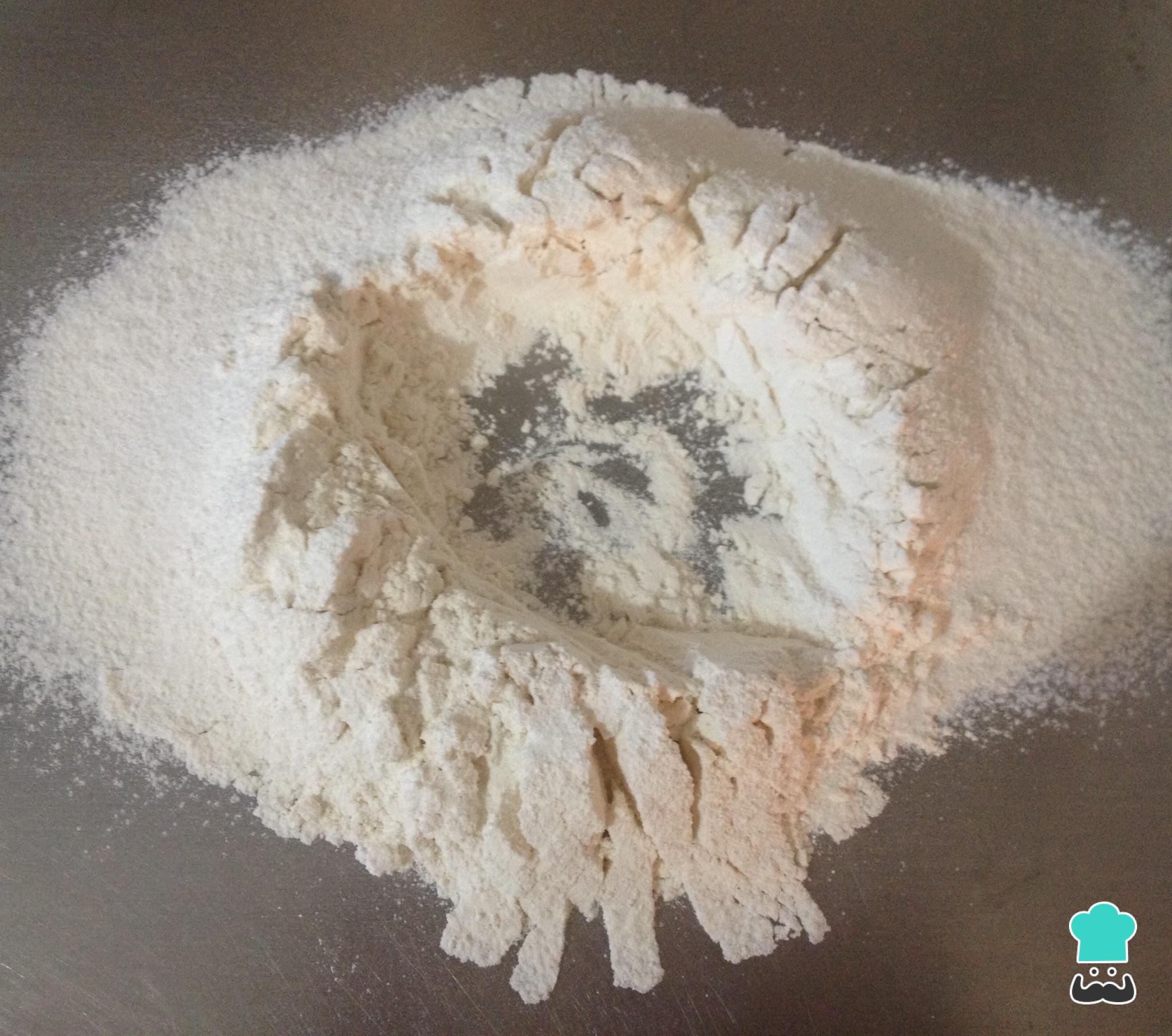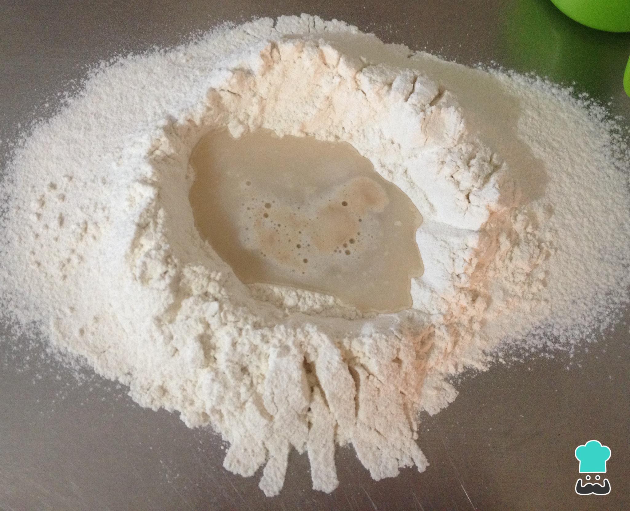 Coloque a farinha peneirada e o sal na bancada ou em uma superfície limpa e lisa e abra um buraco ao centro, como na foto.