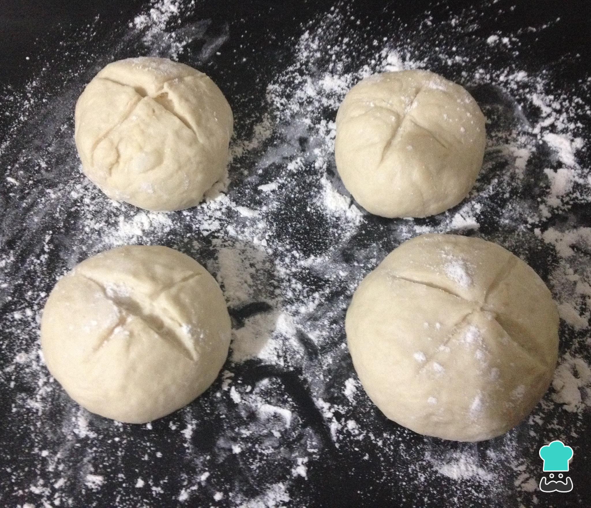 Separe a massa em bolinhas do mesmo tamanho e, com a ajuda de uma faca, faça um corte em forma de X (cruz), como na foto. Coloque os pães em um tabuleiro de forno polvilhado com farinha e leve para assar no forno preaquecido a 180ºC por 20-30 minutos.
