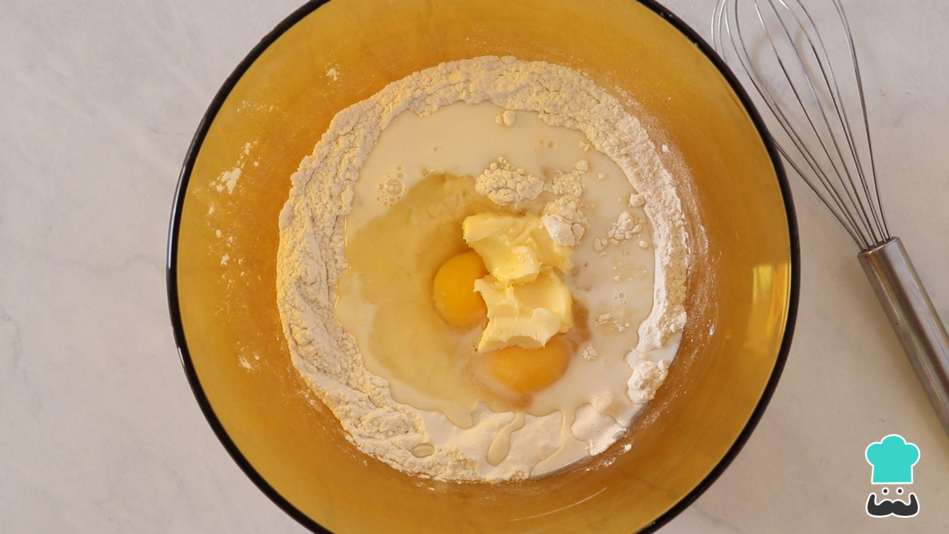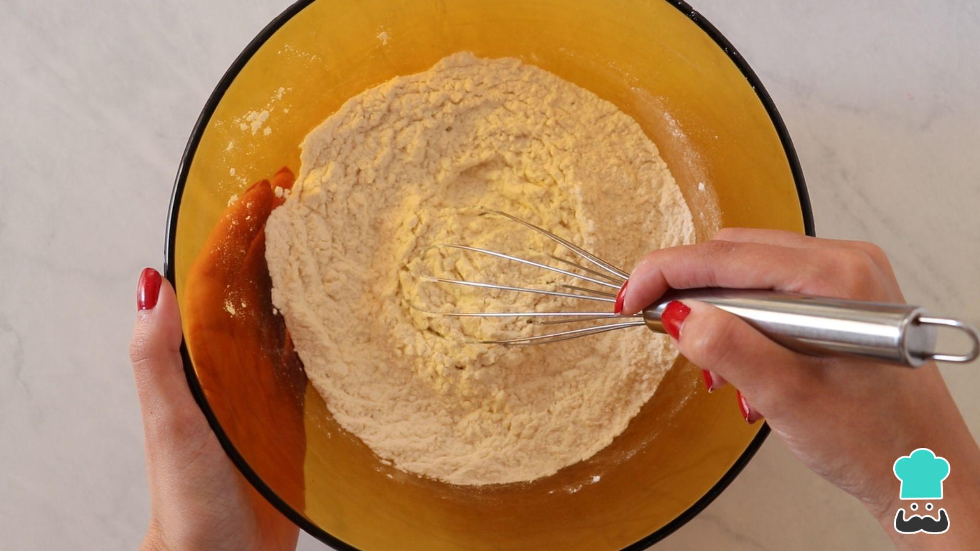 Comece misturando os ingredientes secos em uma tigela: farinha, açúcar, sal e fermento.