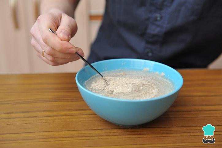 À parte dissolva o fermento e o açúcar na água morna. Deixe por 1-2 minutos ou até se formar uma espuminha, isso significa que o fermento está pronto a usar!