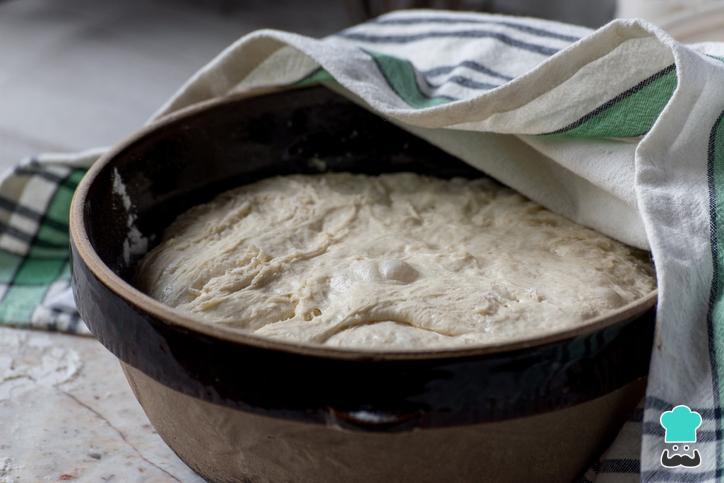 Amasse bem, por 1-2 minutos, até a massa desgrudar das suas mãos (poderá ser necessário colocar mais farinha). Depois modele em forma de bola, cubra com um pano e reserve até dobrar de volume - isso demorará cerca de 1 hora.