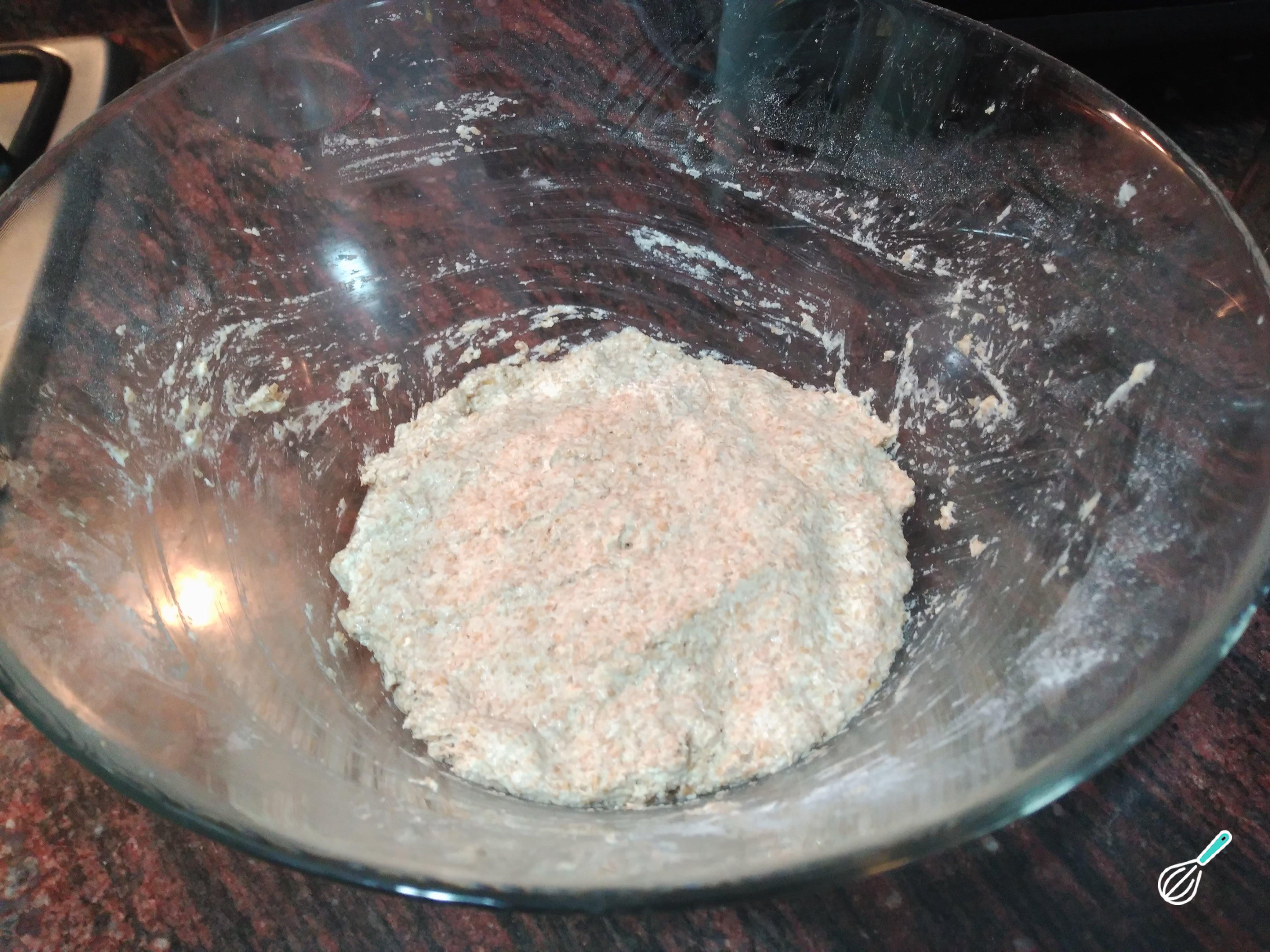 Pouco a pouco adicione a água morna, um fio de cada vez, enquanto mistura a massa com uma colher ou com as mãos. Não é necessário amassar muito este pão integral, ele ficará macio depois de levedar.