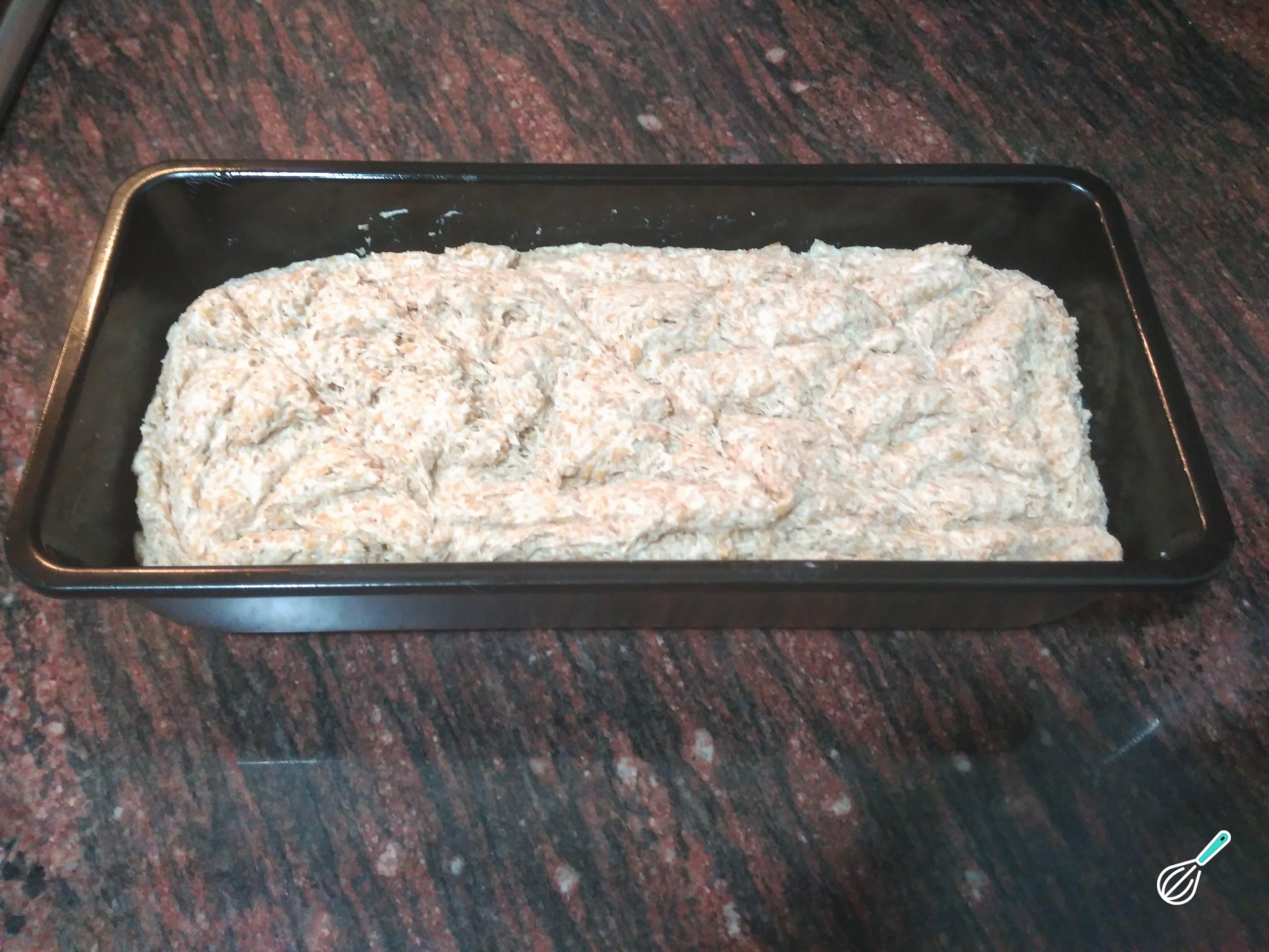 Unte uma forma de pão de 20-25 cm e coloque nela a massa do pão integral. Se necessário use uma espátula para que a massa fique bem uniforme na forma.