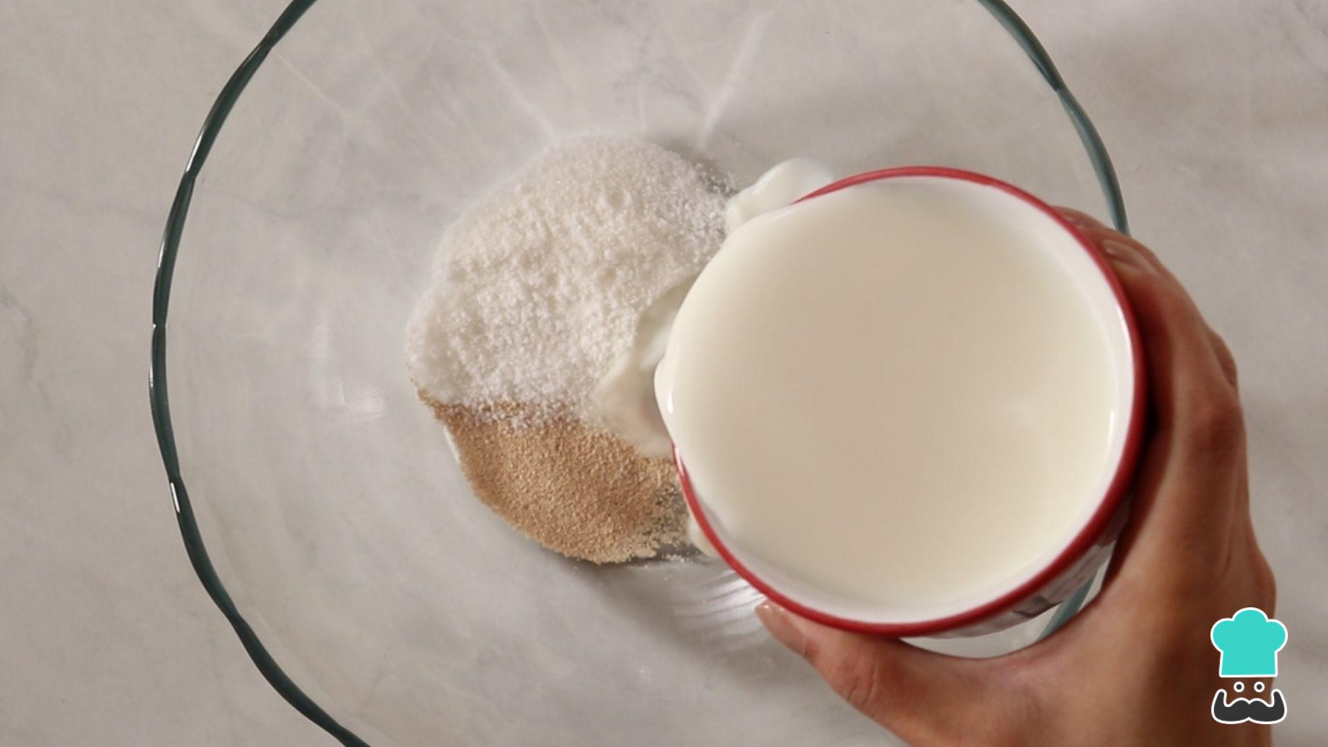 Em uma tigela coloque o fermento, o açúcar e o leite e misture bem.