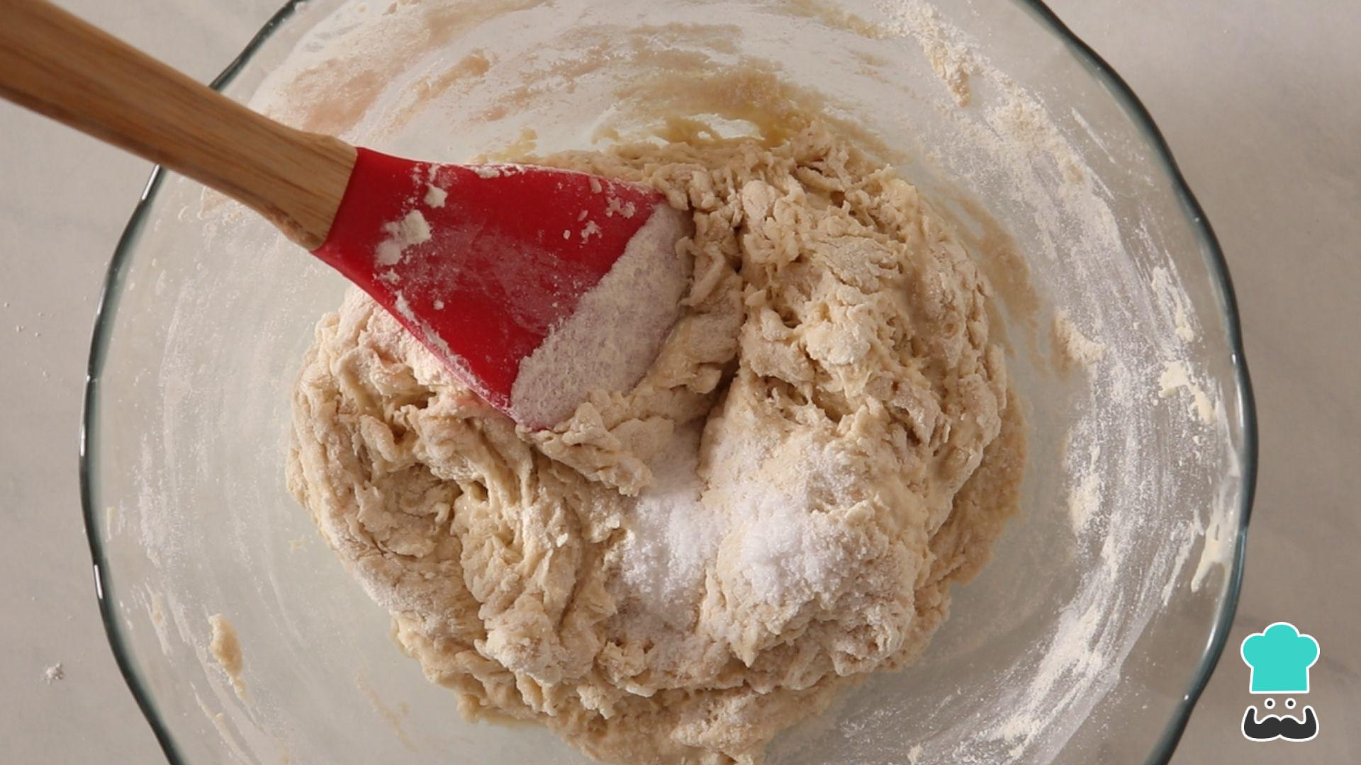 Coloque o restante da farinha na tigela aos poucos e comece misturando com uma espátula.