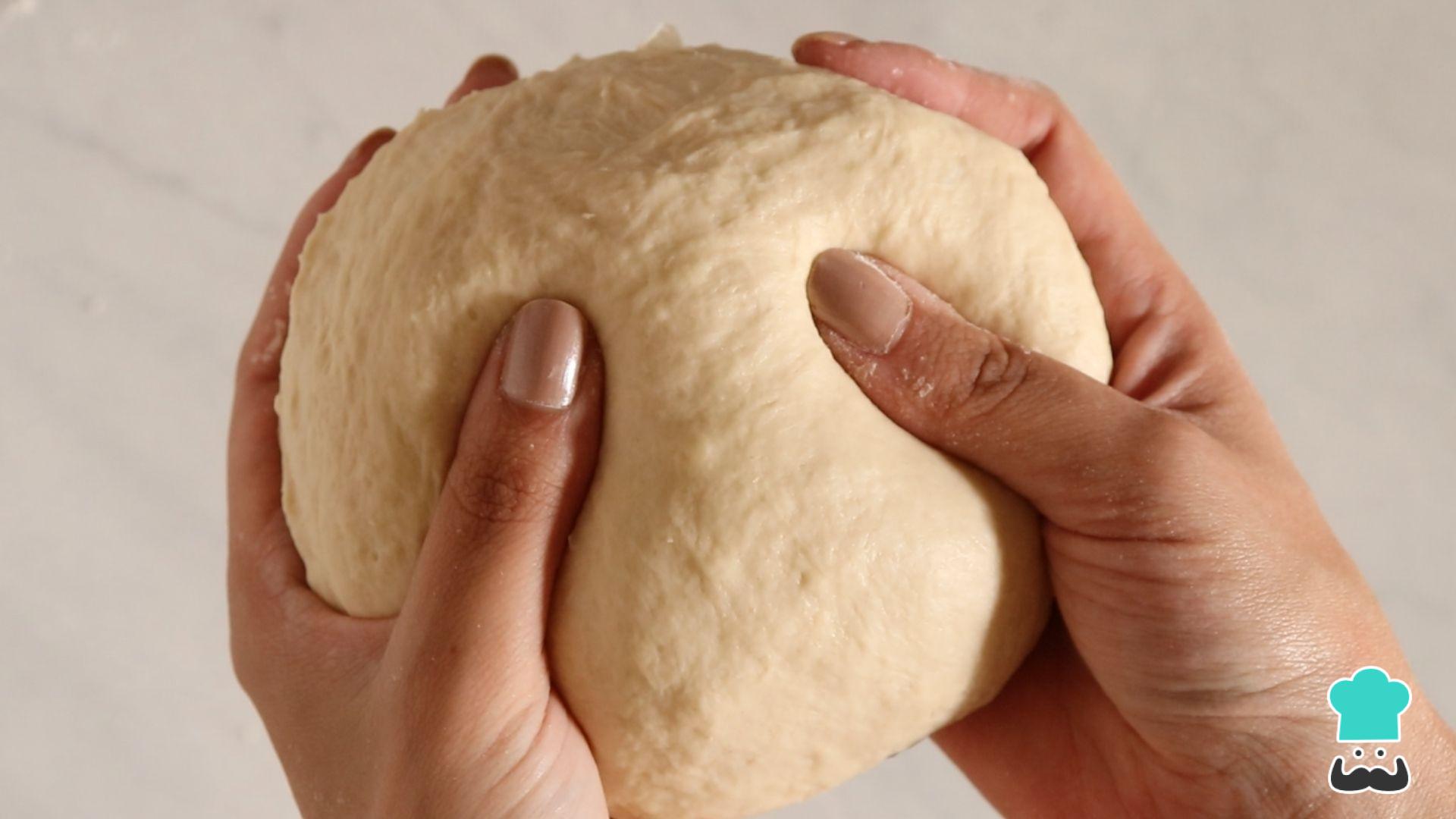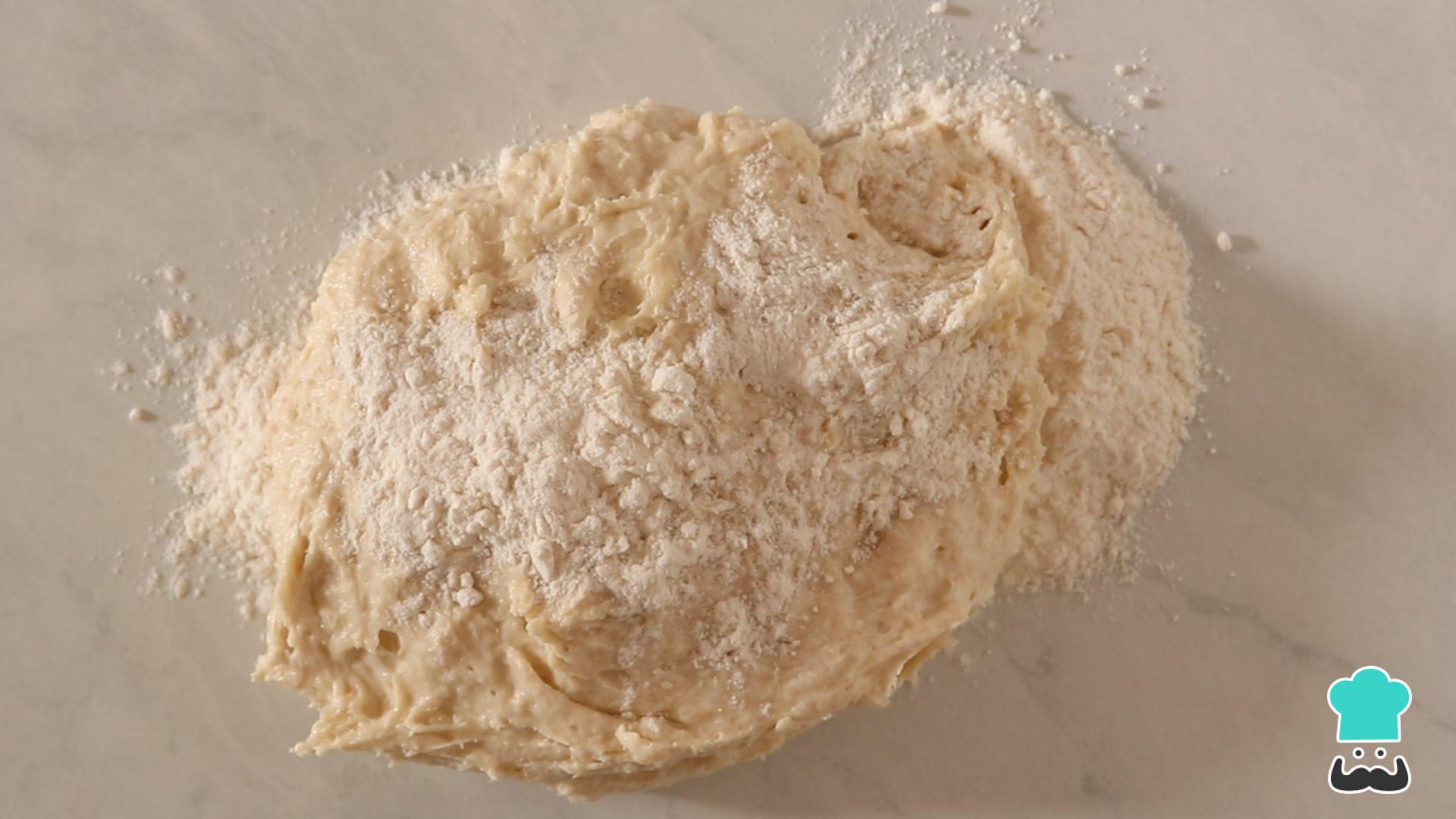 Quando a massa estiver macia e grudando, como na foto, polvilhe o restante da farinha que reservamos no início da receita e sove por mais ou menos 10 minutos.