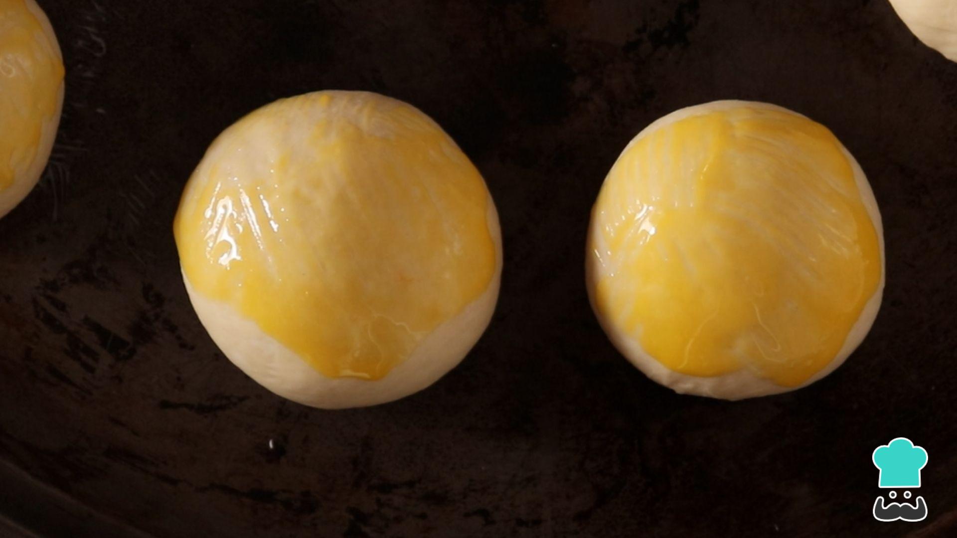 Coloque seus pãezinhos em uma assadeira, cubra com um pano e deixe descansar mais 15 minutos. Passado mais esse tempo, pré-aqueça o forno a 200 graus e pincele o ovo batido na superfície dos pães.
