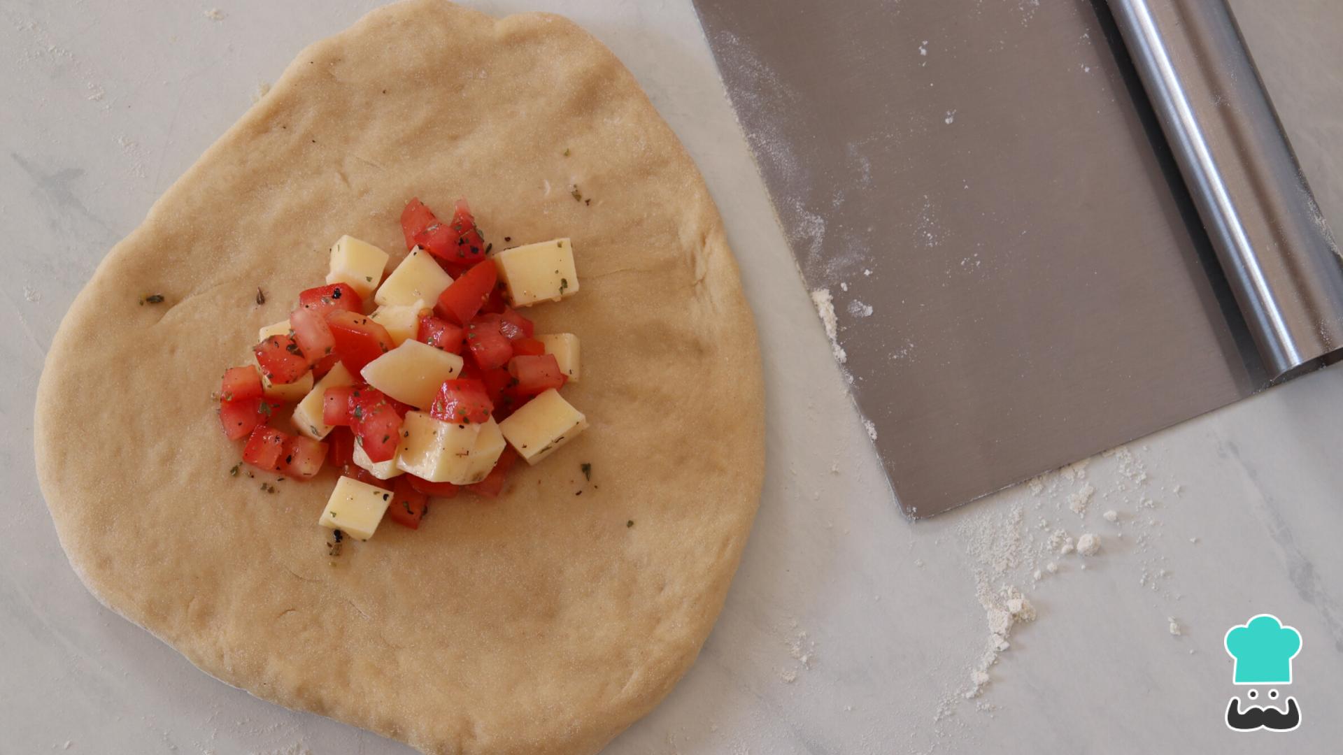 Abra um dos pedaços de massa com as mãos ou um rolo e acrescente o recheio no centro.
