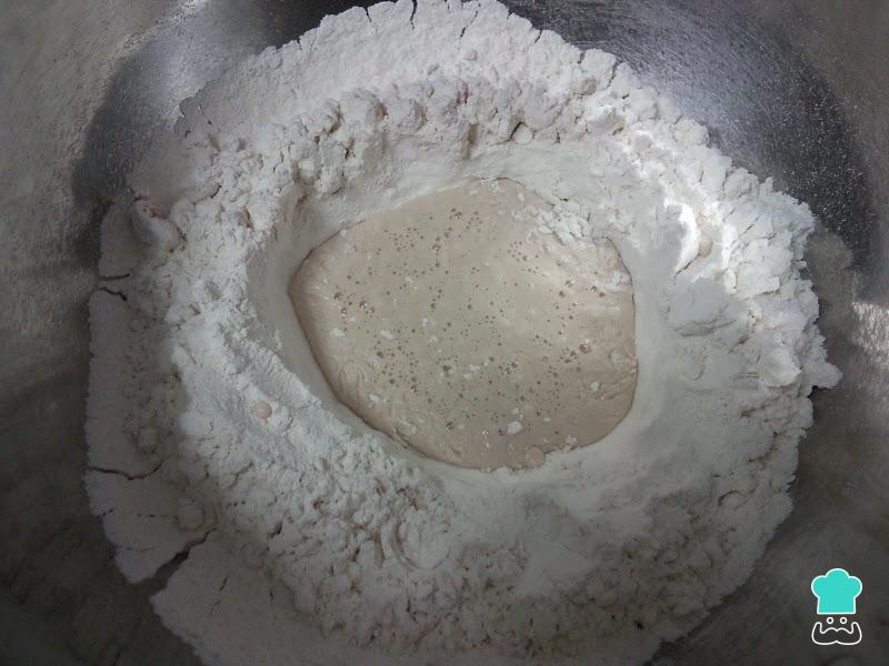 Para fazer este pão chileno caseiro, comece por colocar a farinha numa tigela e fazer um buraco no meio, no qual vai juntar todos os ingredientes e amassar tudo até obter uma bola de massa homogênea.