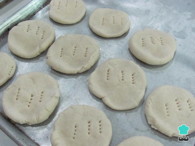 Para terminar o pão chileno, coloque a assadeira no forno pré-aquecido a 300 ºC e cozinhe até dourarem.