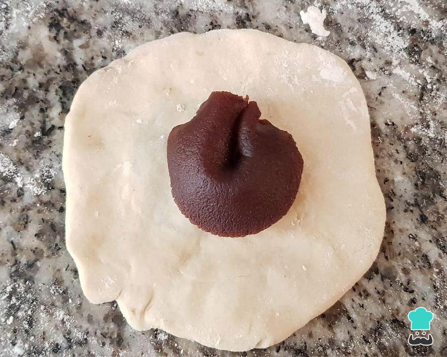 Depois abra cada bolinha de massa com um rolo e coloque ao centro 1 colher de chá da pasta de feijão.