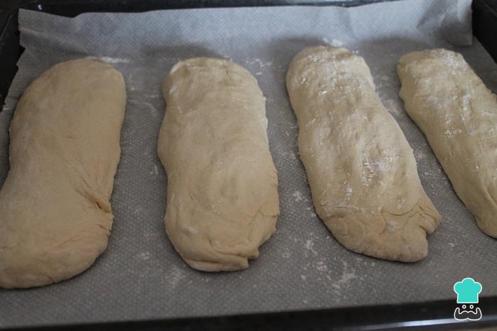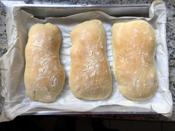 Depois do tempo indicado continue preparando essa receita de pão italiano: divida a massa em 4 partes iguais e modele em forma de pão ciabatta, ou seja, num formato largo e achatado, como na imagem. Coloque os pães num tabuleiro de forno forrado com papel manteiga, mantendo espaço entre eles, polvilhe farinha, cubra e deixe repousar por mais 1 hora.