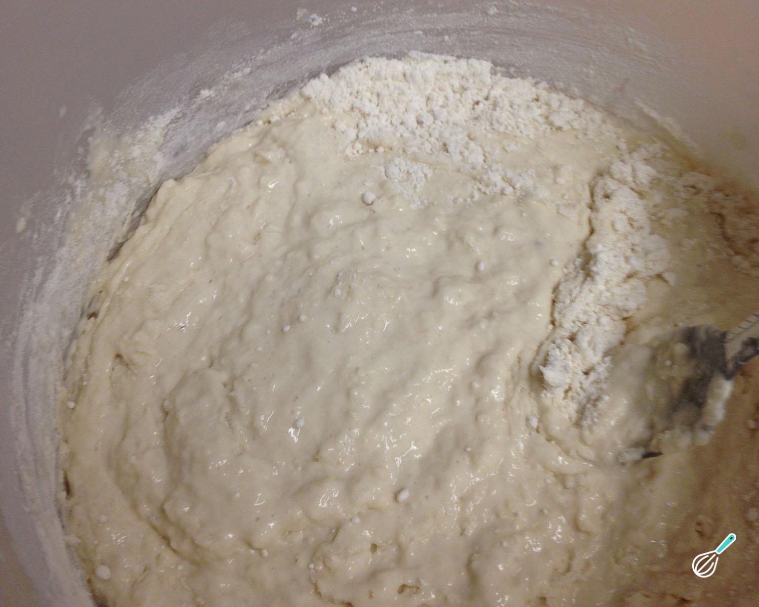 Acrescente o fermento e misture com uma colher. A consistência da massa fica parecendo uma massa de bolo mais espessa, e não compacta como em geral acontece com o pão. Neste momento, se quiser pode acrescentar outros ingredientes a gosto: sementes, canela, queijo ralado, oréganos, etc.